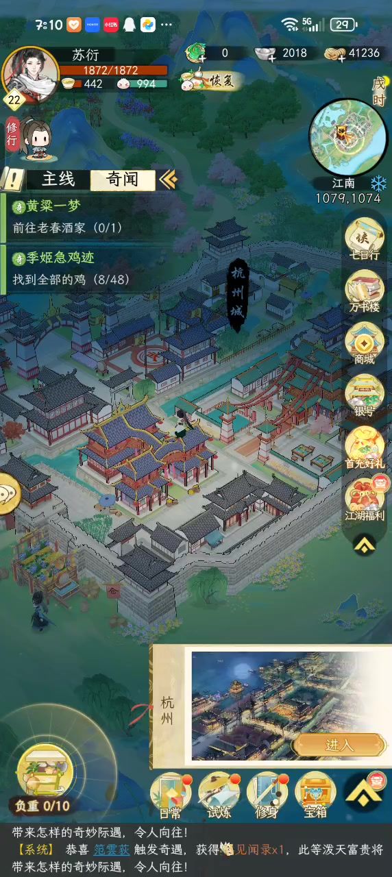 吾日十四省吾身~1.温泉泡否(100精力)2.莲花荡相亲否3.日常 订单 秘境 资源 捐赠否(委托不急,次数会继承第二天,最多七天)4.精力免费恢复一次否5.五次天魔人打否6.宗门工资领否7.十次剿匪否8.猪鸡喂养抚摸否 繁育CD到否8.加入玩家开创宗门后,三次订单交否9.十次学习功法否(换师父的记得学完就退出,早退早CD,快到第二天除外)10.三次官府抓通缉否11.丐