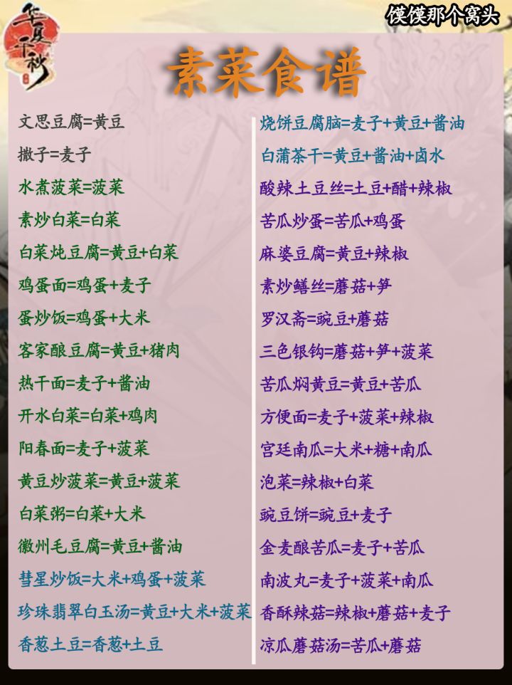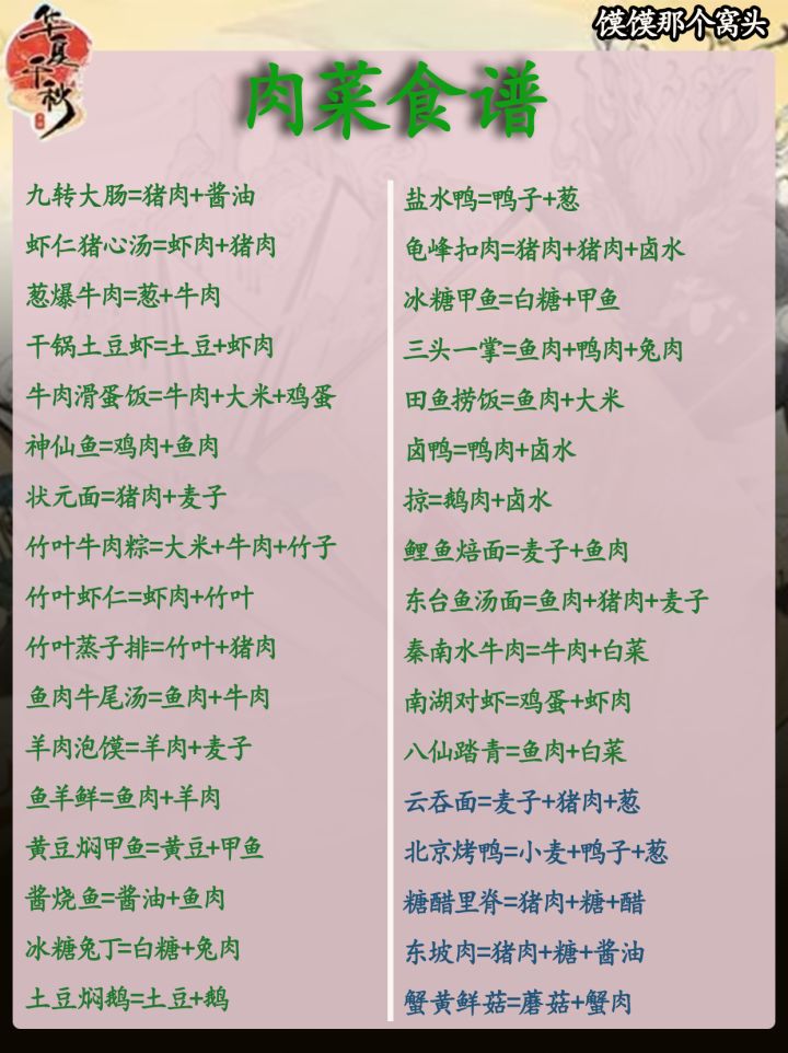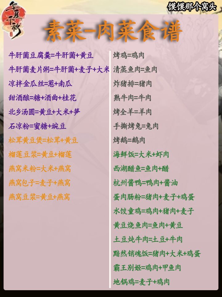 按照素菜-肉菜-甜点-酒的品质顺序食材获取在主页另一个帖子很多食谱、食材可以通过在客栈、珍味楼等等有美事图标的里面NPC购买解锁基础食材和调料还可以在商城-市集购买肉类可以购买也可以狩猎、钓鱼#华夏千秋 #游戏安利 #游戏推荐 #游戏种草计划 #游戏资讯 #游戏讨论 #游戏攻略