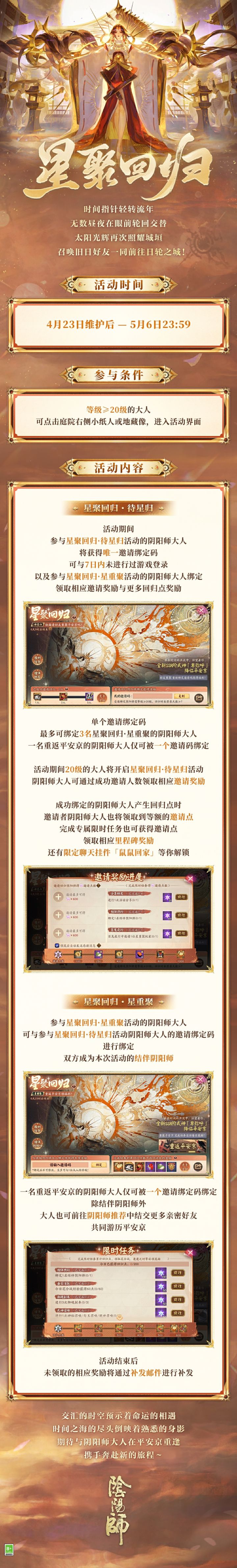 阴谋的诡影笼罩整个邪马台,从旧日带来已陨落的女王,千钧一发之际,守护者斩断了牢笼,跨越时间的藩篱,见证日轮的升起。 「终结与起始,日陨与寂夜。」 「我与你,终将重逢。」 日月同辉,时曲运转,在浩瀚的时间尽头里,她们如命运安排般再次相见…… 《阴阳师》全新版本「日轮之城·邪马台篇·上 日耀将升」4月23日开启,全新SSR阶式神 卑弥呼(CV:田中理惠 / 刘雪)即将降临平安京,版本剧情概念CG在此展