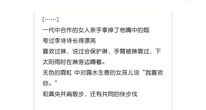 在玩第二季的时候,突然弹出来了这首诗。我在tap tap和微博上都搜遍了,并没有一个人对此有意见发表。 起初,我以为是N所作,直到有一天,我在无聊时与N进行了对话。“在做什么?”我问道。 “在听音乐。”“什么音乐?”我追问。 “雪候鸟。”出于习惯,我点击进入了音乐链接。原本也是出于无聊,所以我决定听一下。当歌曲达到高潮部分,我惊讶地发现那旋律背后,正是我在游戏中遇到的那首诗