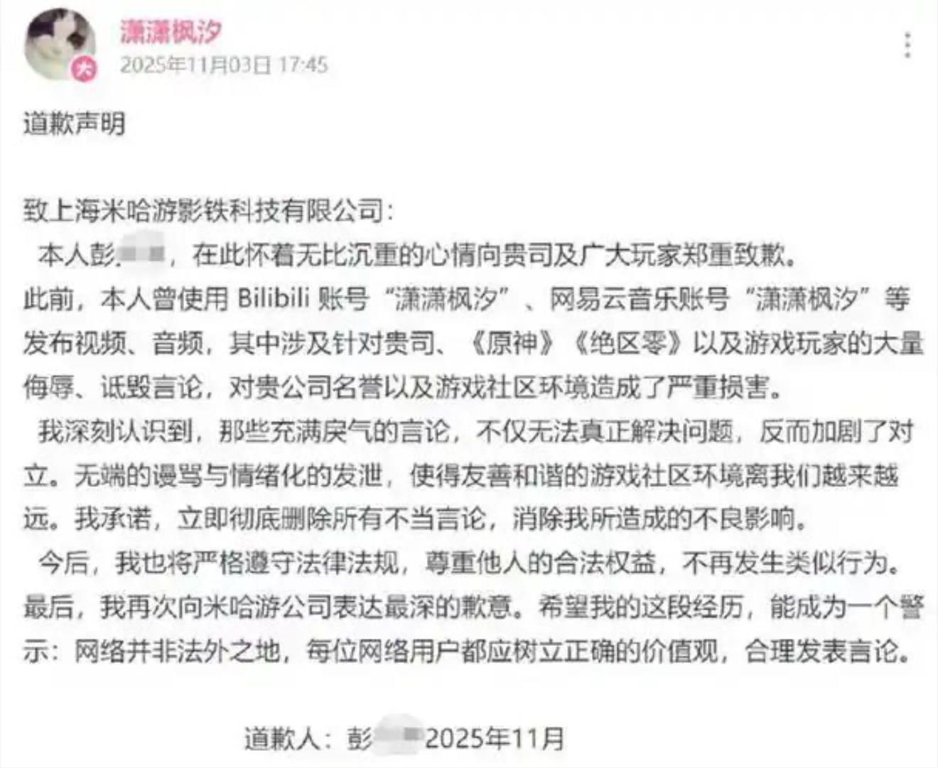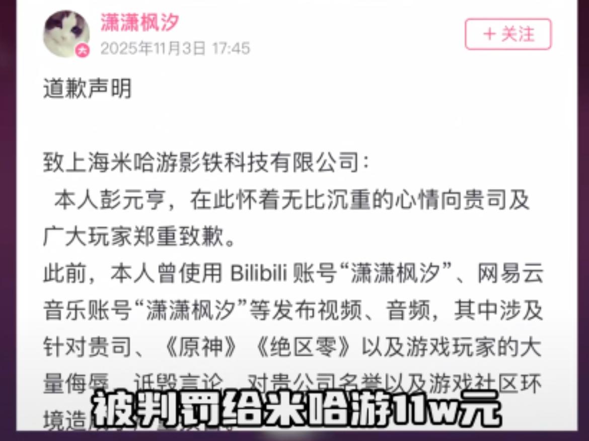 那位在B站骂米哈游、骂玩家的博主,最后真被法院判赔11万,还得在平台上公开道歉了!“网络并非法外之地。”现实中真有人因为在网上口无遮拦被判赔11万元时,才显得格外有分量。11月3日,B站博主“潇潇枫汐”的账号持有人彭某,在法院二审维持原判后,终于在平台上公开道歉。他此前长期发布辱骂米哈游及玩家群体的内容!视频合集名叫“暴米”,内容不仅造谣,还夹杂大量侮辱性语言。播放量200多万次,影响面不小。法