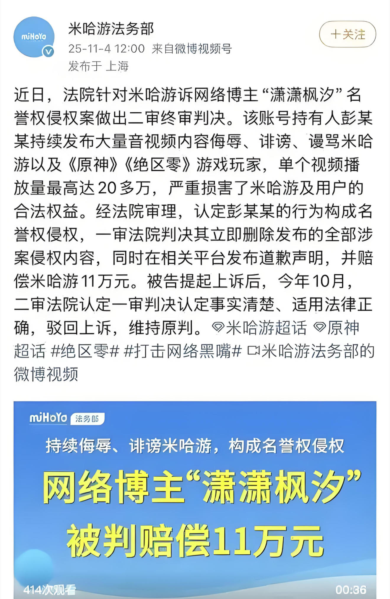 11万判赔+终审胜诉!米哈游维权再亮剑,恶意诋毁博主公开致歉‼️✅️近日,米哈游诉网络博主“潇潇枫汐”(账号持有人彭某某)名誉权侵权案迎来终审结果——上海市第一中级人民法院驳回上诉,维持一审原判,认定该博主长期发布侮辱诽谤内容构成侵权,需删除全部涉案内容、公开道歉,并赔偿米哈游11万元经济损失及维权开支 !✅️这一判决不仅为被侵害的企业与玩家正名,更彰显了“网络绝非法外之地”的法治底线。🤔值
