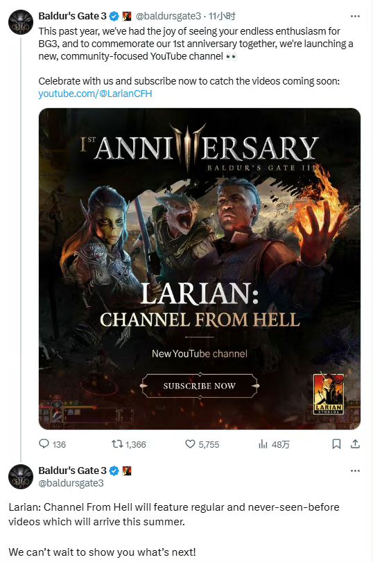 8月3日,《博德之门3》发售1周年纪念日🔥🔥🔥拉瑞安为此特别开设了一个神秘的YouTube频道,并命名为“来自地狱的频道”(Channel From Hell)官方表示,该频道将以社区为中心,今年夏天开始,会定期发布此前从未发布过的视频估计是一些幕后花絮,没啥看头,不知道大家怎么看?#