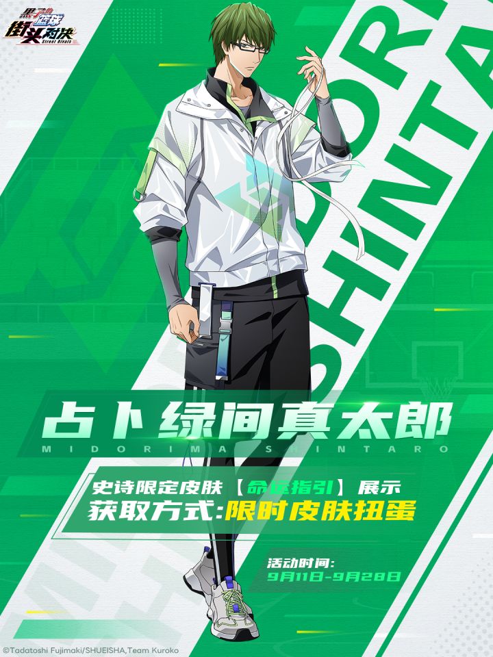 本次小葵要介绍的是「占卜绿间真太郎」!就让我们来认识游戏内的他吧~【占卜绿间真太郎】配音:小野大辅 学校:秀德高中「奇迹的时代」成员之一。极具威胁的3分射手,整个球场都是其射篮范围。因为何事都要尽人事的性格,总是随身携带着幸运物。【必杀技能:晨间占卜】"绿间真太郎使用“晨间占卜”时,会随机根据占卜携带对应的幸运物,不同的幸运物会强化不同的篮球技巧,每次占卜效果持续30秒。━━━━━