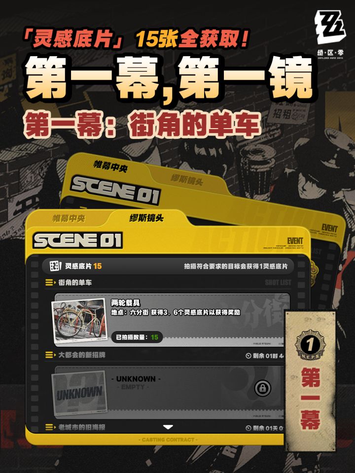 UID:11102715哼哼!这里是鱼酱(法厄同版 ✧1.1版本限时活动【第一幕,第一镜】系列攻略来咯!本次活动需要3天完成第一幕的主线是选角『穿正装的暴徒』和取景『不幸的珠宝店』支线的灵感底片收集是『街角的单车』,需要拍摄两轮载具!小建议:第一天的「灵感底片」收集均在六分街完成,获得6个即可拿满奖励哦~如果对你有帮助记得支持摸鱼酱💓哦!收藏起来不走弯路✅#绝区零 #绝区零攻略#卧底蓝调