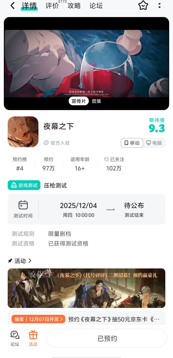 重振家族自然免不了要招募人才JD上传、HC充足……哦?似乎一下子就99+了!BOSS,各类“求职信息”正以千奇百怪的姿态向您涌来……不妨打开后台,看看夜行者们都发了些什么吧~>>>边缘压枪,本能走火。《夜幕之下》 招募进行中!🔮游戏预约:📝测试招募:>>>测试信息说明招募时间:11月20日-11月27日23:5测试类型:安卓/PC限号不计费删档测试测试时间:12月4日开启#代