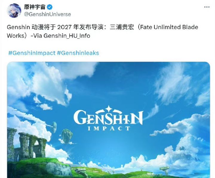 孩子饿惨了!《原神》长篇动画2027来袭,飞碟社+《Fate》导演操刀“🔔等了快三年,终于等到‘喂奶’了!”《原神》玩家盼了无数个版本的动画消息,终于有了确切动静✅️据专注项目爆料的海外消息源确认,米哈游与ufotable(飞碟社)联手打造的《原神》长篇动画,预计将于2027年正式上线,导演敲定曾参与《Fate/Zero》《鬼灭之刃 无限列车篇》的三浦贵博 。✅️这场“漫长的等待”要从202