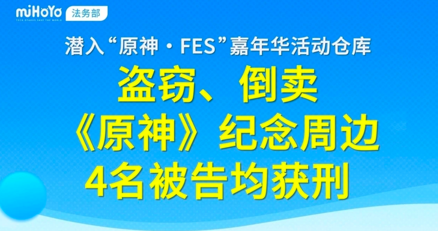 今日,米哈游法务部发布案件通报视频,披露一起“原神・FES”嘉年华纪念周边被盗案的判决结果4名涉案人员已被依法惩处。该案发生于2024年 “原神・FES” 嘉年华活动期间,被告袁某某、王某破坏展会仓库门锁潜入作案,盗走仅限参展玩家领取的限量纪念周边,于某某则负责联系买家销赃,三人通过变卖非法获利超2万元。收赃人李某某在明知周边为赃物的情况下仍予以收购,形成完整犯罪链条。近日上海市青浦区人民法院