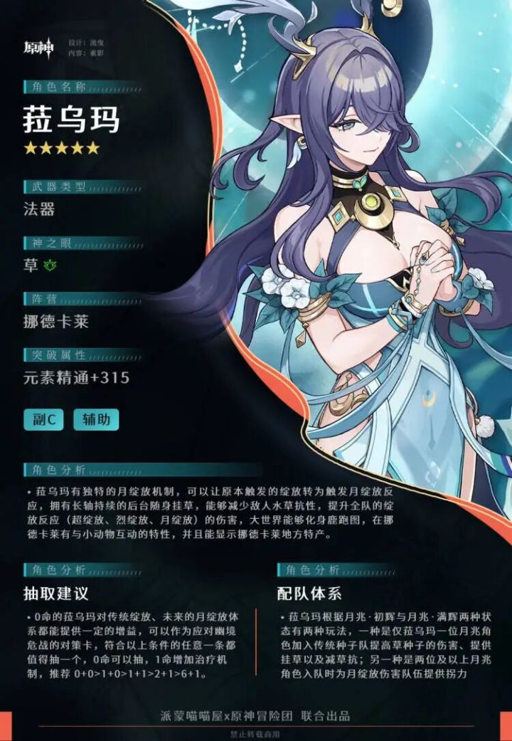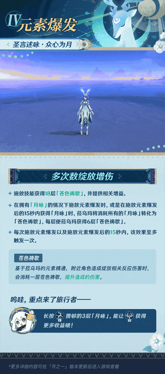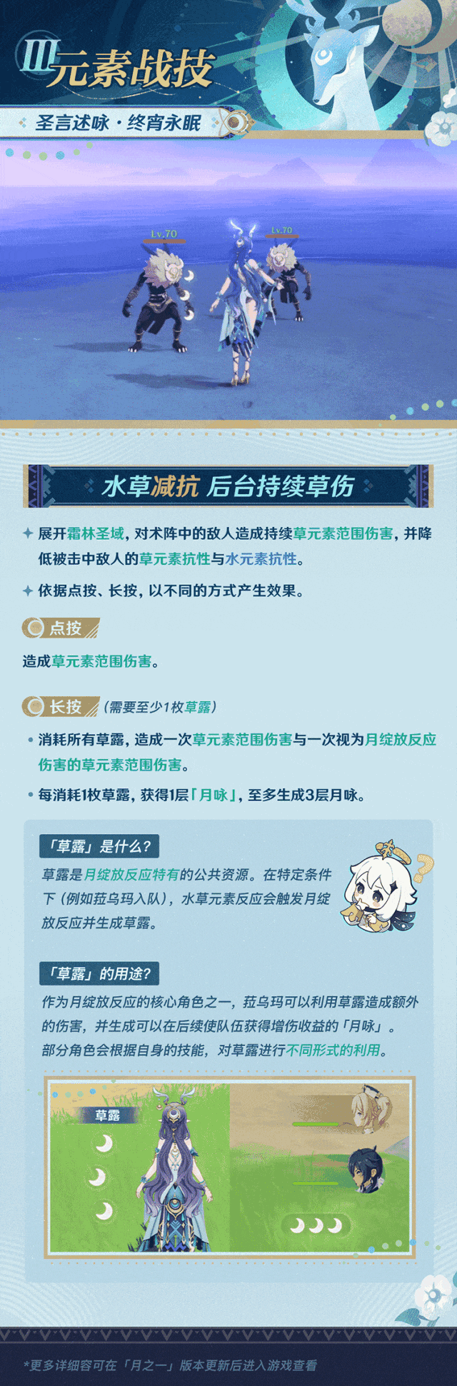 uid:100047993▌P1 角色定位▌P2 天赋技能 月绽放反应和月绽放伤害月绽放是绽放反应的月曜反应天赋分析[普通攻击A]效果:普攻造成三段伤害,重击可以化身为鹿[元素战技E]效果:展开霜林圣域,2秒造成一次范围草伤,减少敌人水草抗性,至少拥有1枚草露可以长按,消耗所有草露,造成一次草范围伤害和视为月绽放反应伤害的草伤,依据消耗的草露数,会获得最多三层月咏[元素爆发Q]效果:释放