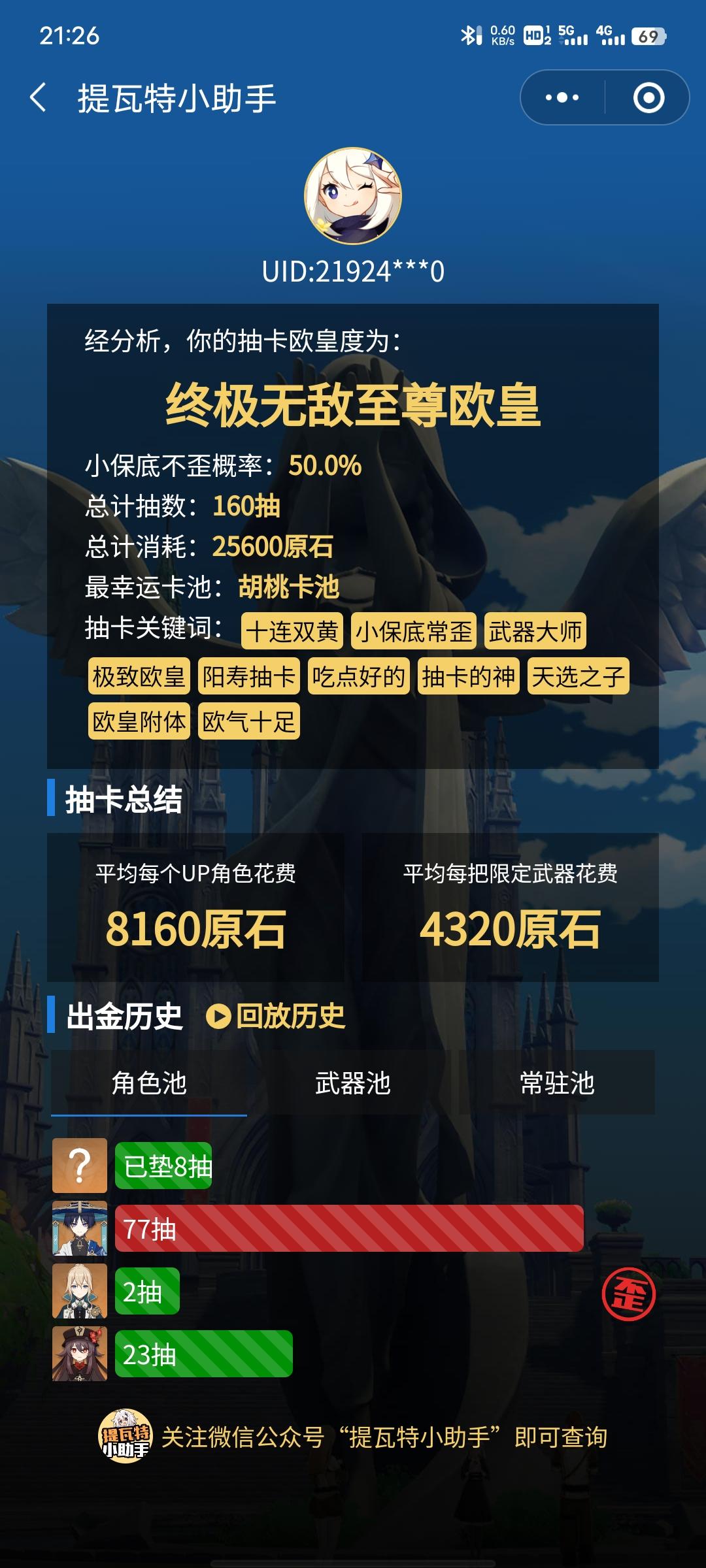 3年了,角色池一直保持小保底不歪为0的记录,共花了多少原石不清楚,但玩得最上头的时候,要两个月才出一个金。抽卡记录只留下了这点,有会查全记录的可以教教我怎么查。里面所有五星只有七七是常驻出的(没放进来)#原神抽卡记录#游戏讨论#原神