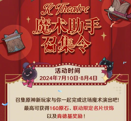 旅行者们,大家早上中午下午晚上凌晨好啊这里是天龙筮,KFC联动活动第二波「K Theatre魔术助手召集令」已经开启了活动时间:2024年7月10日- 2024年8月4日参与方式:活动期间,召集原神新玩家助力「需要两名新玩家」新玩家认定规则:未拥有原神角色的用户奖励规则:老玩家集期队伍后可领取:联动限定名片纹饰「庆典·盛宴·其二」x1、肯德基式蛋挞买一送一优惠券x1、肯德基礼品卡(5