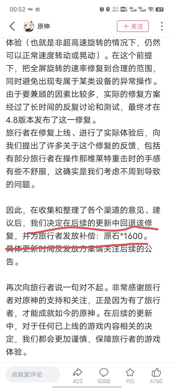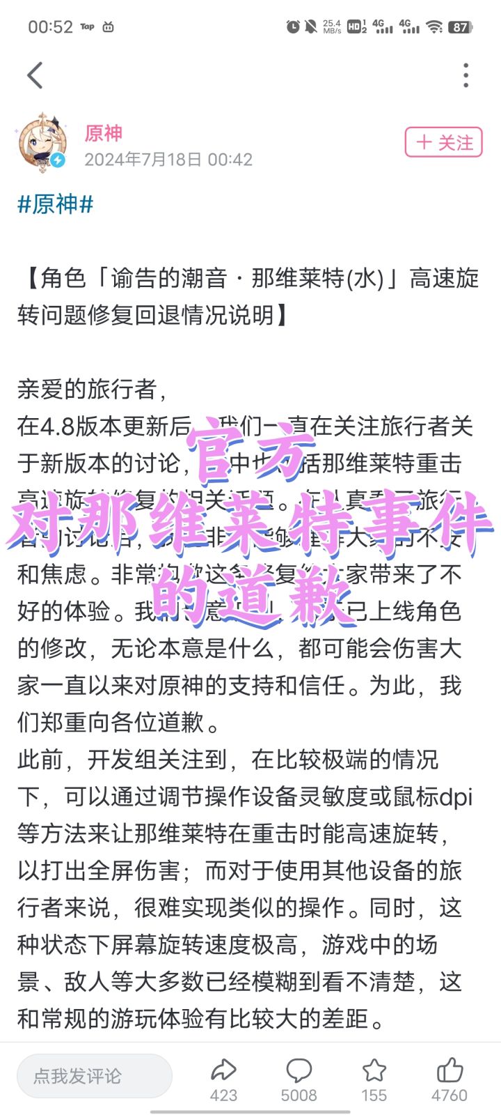 我们胜利了7.17日4.8版本更新后,那维莱特旋转被当bug修复官方被冲一天了,各种删帖目前官方已在小破站发出道歉:回调+1600原石那维莱特:潮水啊,我已归来!对此,你怎么看?#今天游戏圈发生了啥 #原神 #游戏资讯 #吃瓜爆料
