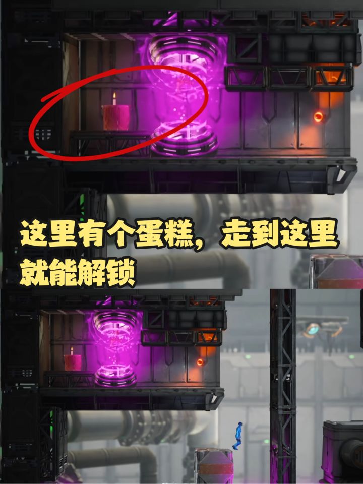 机动战术隐藏彩蛋,“蛋糕不是谎言”成就#双影奇境攻略 在最终黎明下面有一个机动战士的支线,你得往前走,一直到图二这个地方,上面有顶蜡烛(其实是蛋糕),跳到上面就能解锁#双影奇境 #游戏推荐