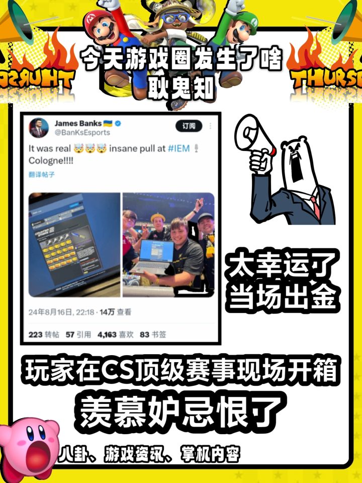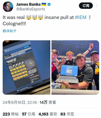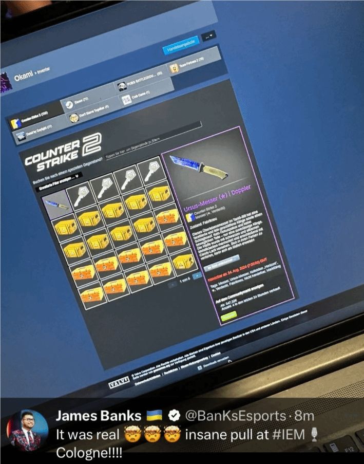 《反恐精英2》的顶级赛事IEM科隆进入线下阶段,而在这次比赛的观众席上也有玩家玩起了现场开箱,导播也识趣地给到了这些玩家们镜头,但谁曾想到这位玩家居然当场出金,得到了一把价值不菲的熊刀-多普勒。。#今天游戏圈发生了啥 #发现好游戏 #发现好游戏 #游戏八卦 #游戏资讯 #反恐精英