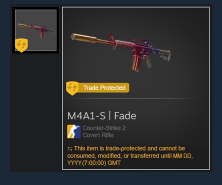 在7月17日的更新中,v社对cs2的交易新增了交易保护机制,目前所有的cs2交易在进行交易之后,库存物品会进入“交易保护”。具体说明如下:当涉及支持交易保护的游戏物品的交易确认后,物品会立即送达,您可以在游戏中装备并使用它们。在接下来的 7 天内,这些物品被视为处于“交易保护”状态,不能被消耗、修改或转移。一旦 7 天期限到期,交易保护状态即失效,该交易将无法再被撤销。简而言之是玩家通过交易卖