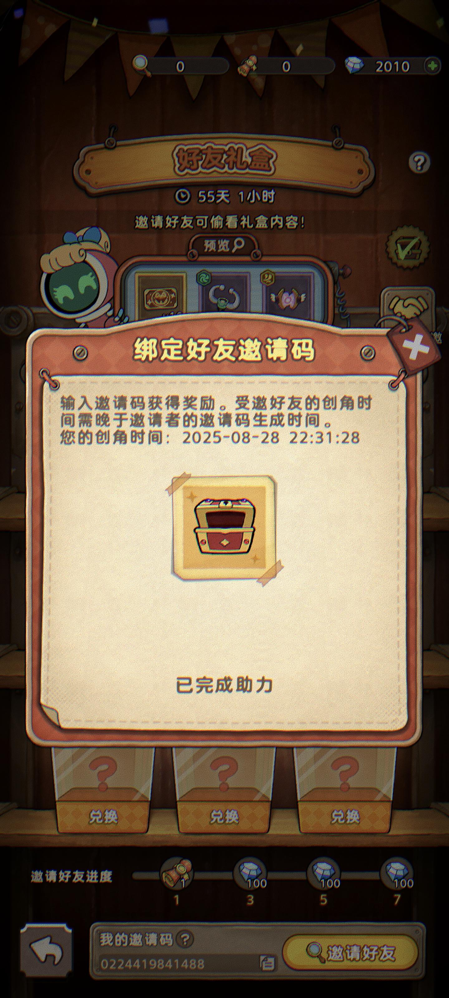 1198529251396 绑定给200钻石,下附兑换码,互帮互助 《发条总动员》免费得招募券和飞行员!在主界面【好友礼盒】活动中输入邀请码1198529251396帮我绑定,你也能领助力奖励!速来下载! 注:受邀好友的创角时间需晚于邀请者的邀请码生成时间。邀请码生成时间可以点击活动界面中的【邀请好友】按钮查看。 我的邀请码生成时间:2025-09-08 01:03:07https://wefly
