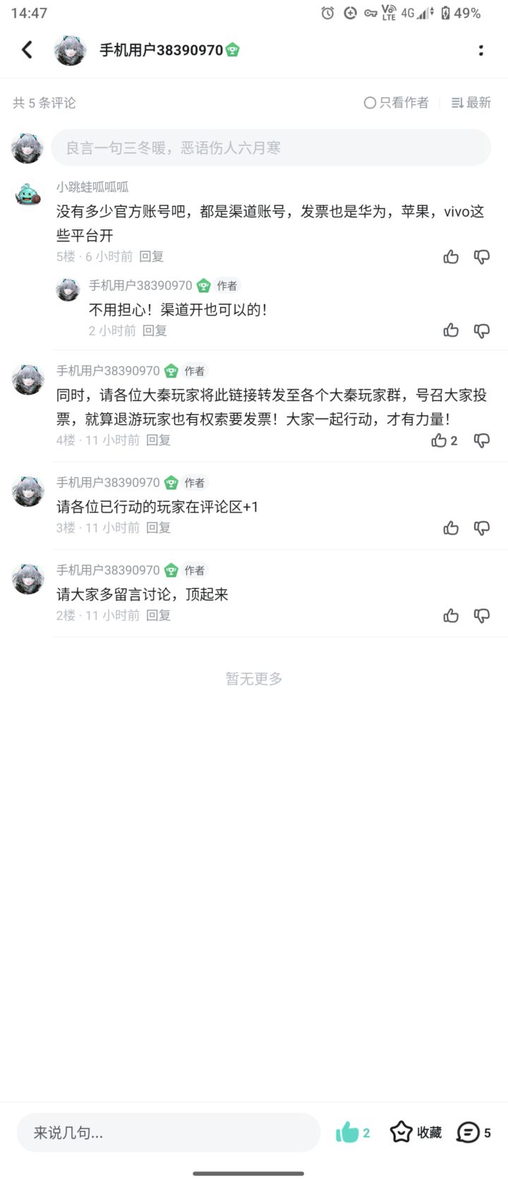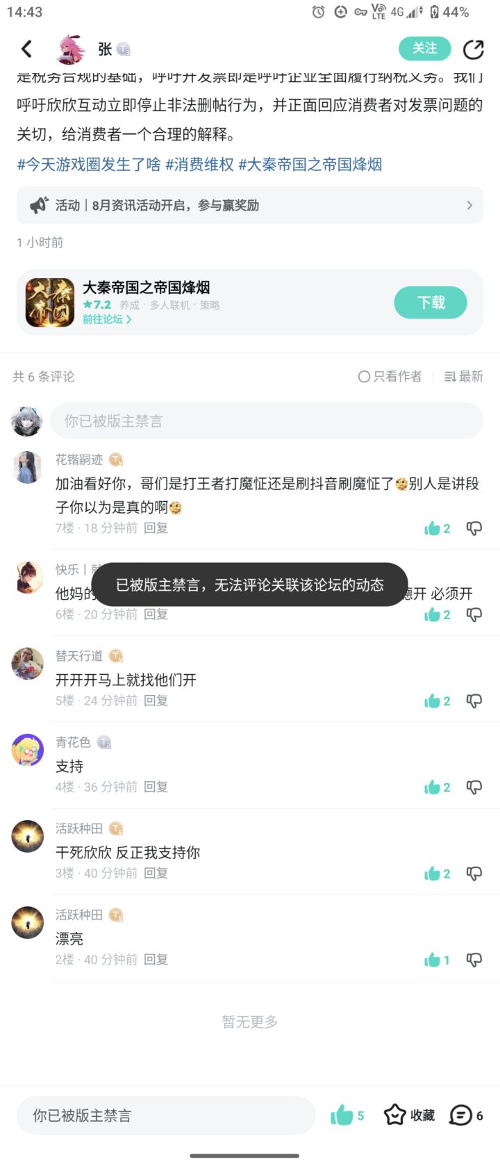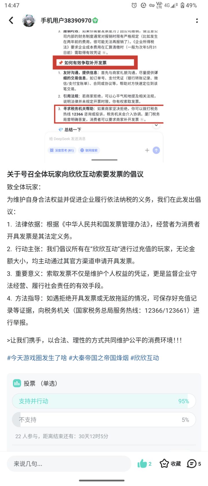 我的两个账号接连遭到欣欣互动无耻禁言,简直欺人太甚! 所有玩家请立刻响应「向欣欣互动集体索要发票」的行动倡议!如果这个号再被禁言或删帖,我将毫不犹豫在抖音等各大短视频平台公开曝光,并持续到当地有关部门的官方账号下方留言举报! 玩家必须团结起来!强烈呼吁各位大秦玩家把这条内容一键转发到所有玩家群——哪怕你已经退游,只要消费过就有权索要发票! 这是我们消费者的合法权益,更是我们对野蛮行为最直接的