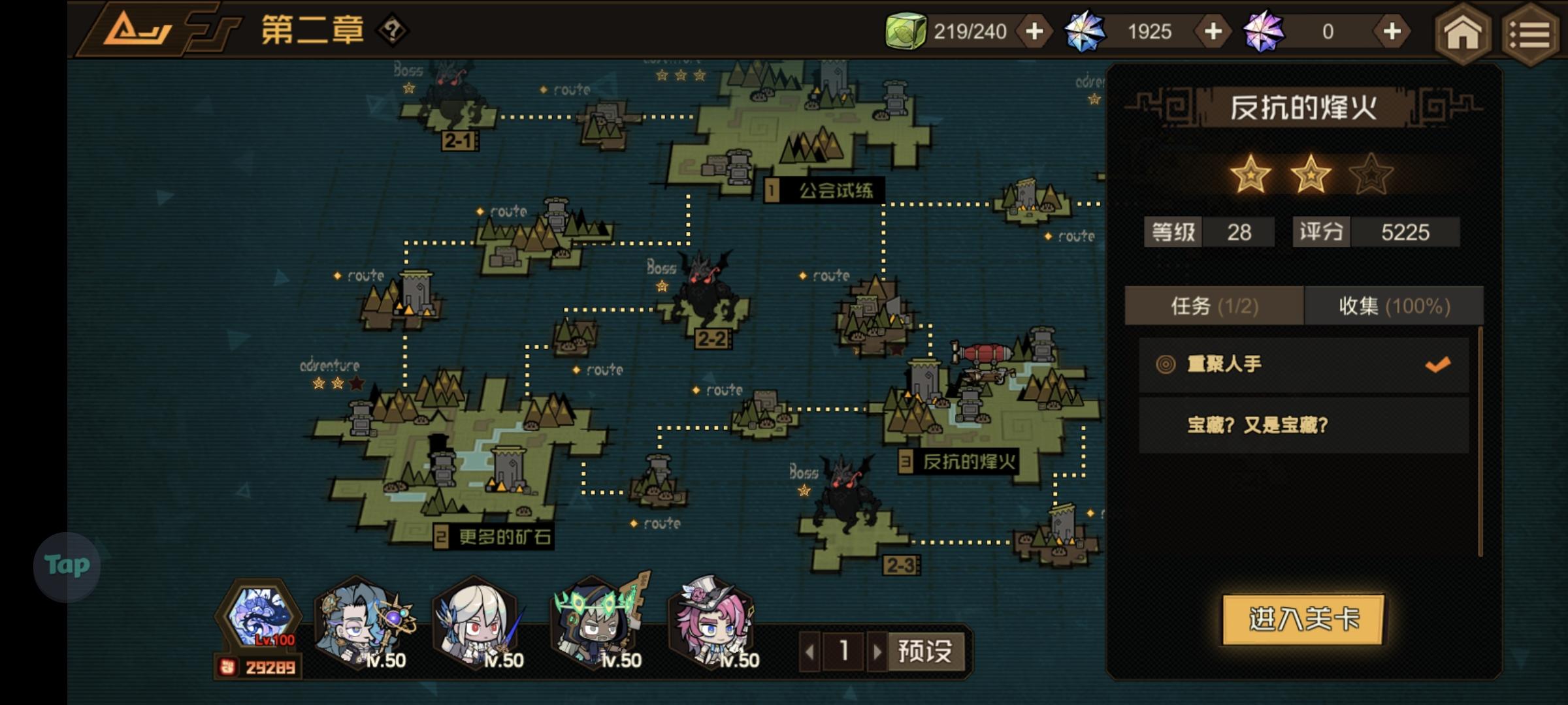 🎮玩法最初看到叠罗汉玩法还感觉挺新鲜的,直到后面解锁了自动战斗和多倍加速,最终也走向了数值卡牌的常规套路。叠罗汉虽然可以打到空中飞行的敌人,同时伤害有一定增加,但队员也更容易被攻击,存在被打下去的可能性。地图玩法带有一定肉鸽元素,有一些道路分支,最初的地图比较简单,宝箱很容易发现。随着关卡推进,难度逐渐增加,宝箱位置也就越来越隐蔽,循序渐进的体验较好。扩展玩法就没啥新意了,日常资源副本同类卡