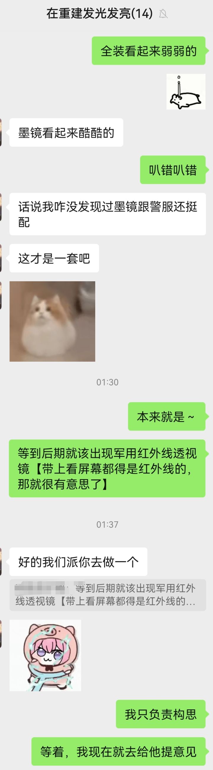 灵感来自和游戏好友的胡言乱语主打一个抽象又能落实【请忽略我弱弱的全装】就是说既然墨镜和警服那么合适就该给军装配一副军用红外线眼镜然后来个新效果【带上看东西就是红外线效果】具体还能看到啥,你们策划考虑一下哈哈哈哈哈#重建家园 #重建家园武器 #可以快点更新一些别的武器吗 【这个话题乱选的,不是真