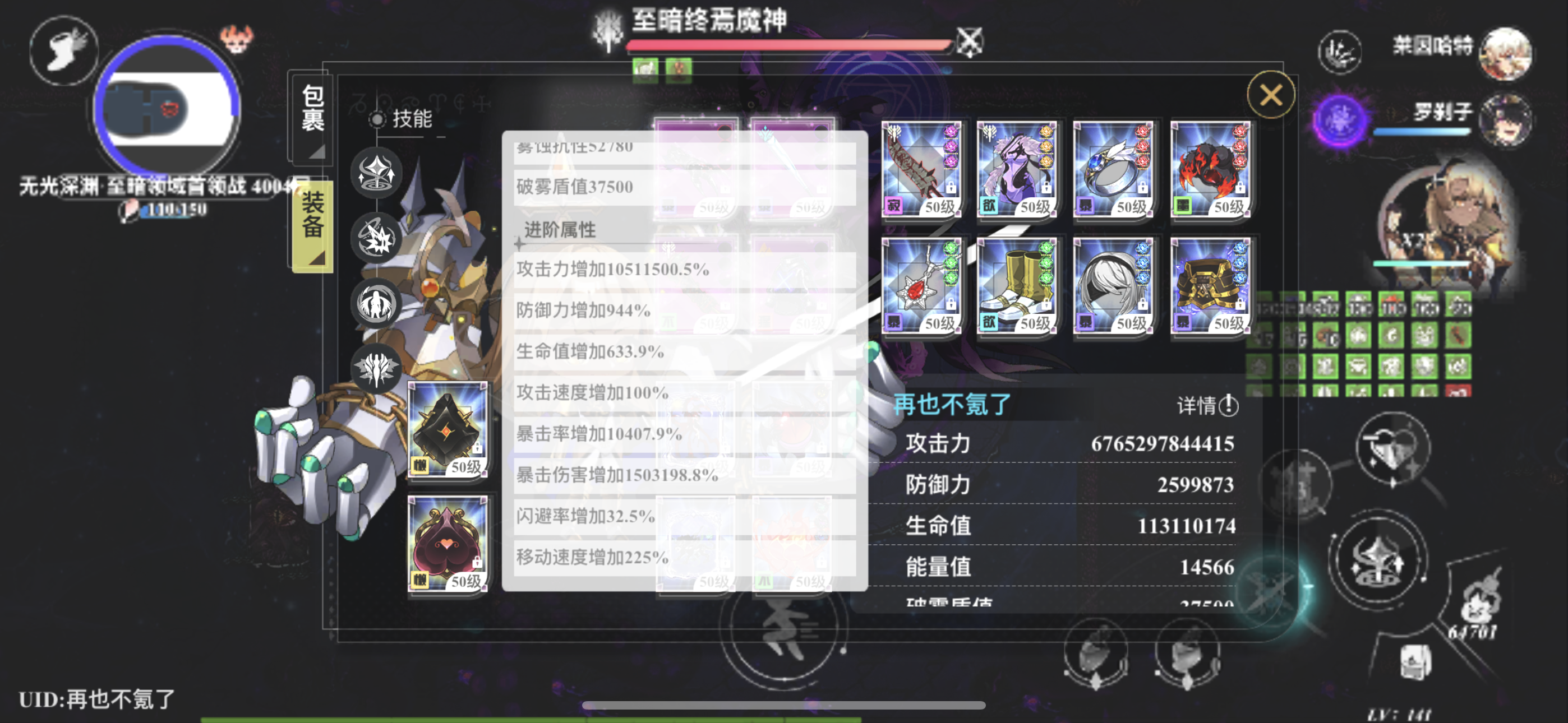 先推到1400层再说,我这边配置4誓约罗刹子和满命雅再加命运生成,装备选择主要是鞋子和魔童都必须带30移速词条,附加两双鞋子自身的移速加成,其他装备凑4爆(怪基本秒,无需开6爆打持久战)首先条件就是命运生成,爆伤转能量,4誓约罗刹子高于100暴击率转爆伤总加成,雅随从技能能大招返蓝,基本不会空蓝,宝石记得带刷新宝石和石化免疫。召唤兽我还没有诡秘之子,只有恶魔统计跟魔爪,有这几个可以搭。如果命运没有
