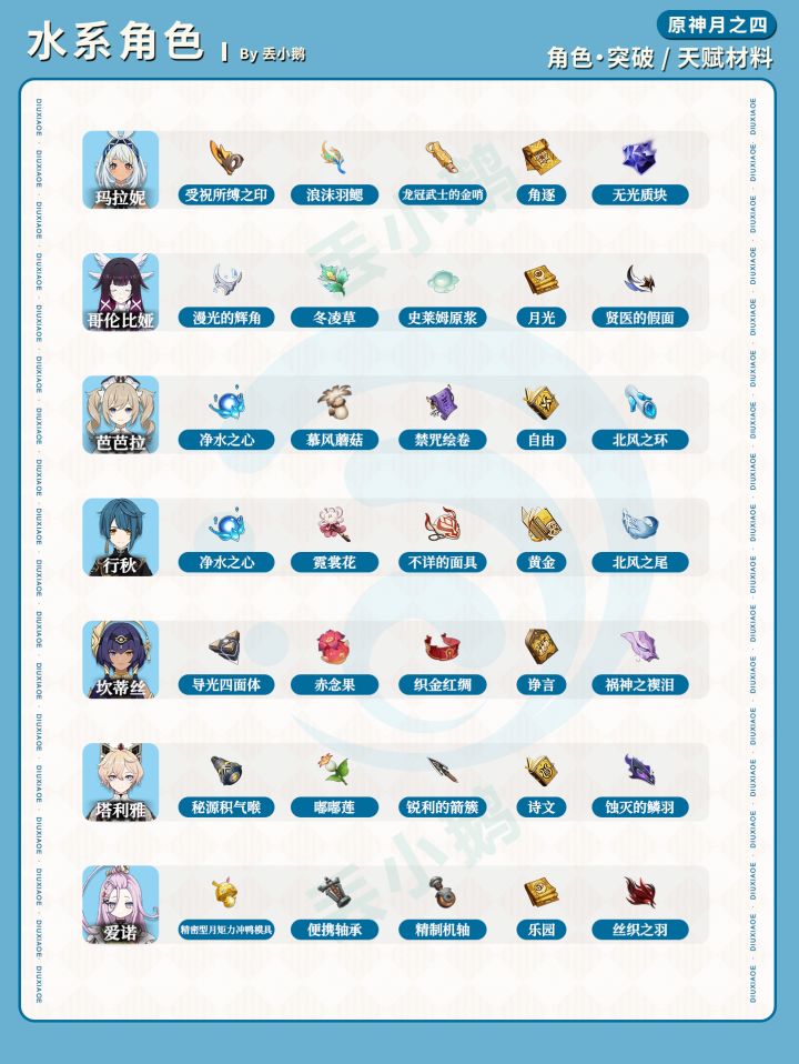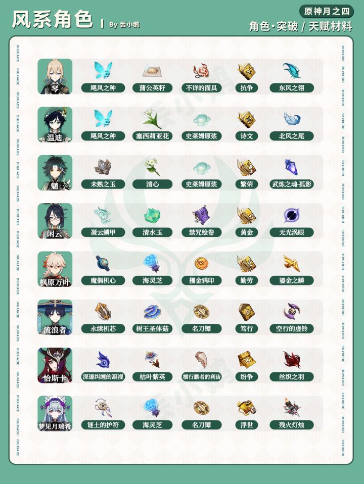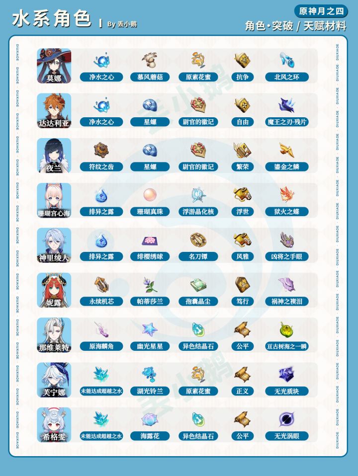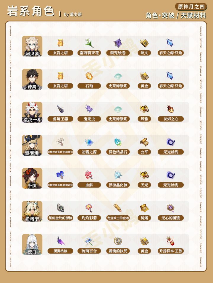 UID:220052599旅行者,你来啦~我是丢小鹅,为你带来【原神月之四】全角色突破/天赋材料一览表。UP角色● 上半:哥伦比娅(新)、伊涅芙、赛索斯、菲谢尔、伊法● 下半:兹白(新)、那维莱特、叶洛亚(新)、爱诺、五郎= 特别说明 = 旅行者所需周本材料 旅行者(风、岩):东风的吐息旅行者(岩):北风之尾旅行者(雷):龙王之冕旅行者(草):凶将之手眼旅行者(水):生长天