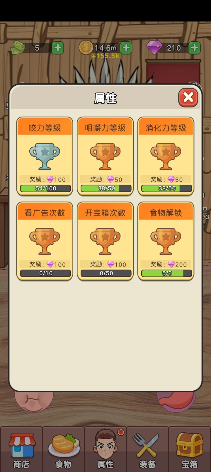#吃货进化论 成就开新进度,降低难度宝箱每进一个新文明加一点爆率文明丨+5%,文明丨丨+5%文明丨丨丨+5%感觉现在用每个文明需要解锁的装备,我现在是8级吃东西都要7口,给的也是8级装备加成的金币,之后成纯挂机也不行每次上线给的不如你在号上两分钟吃的多
