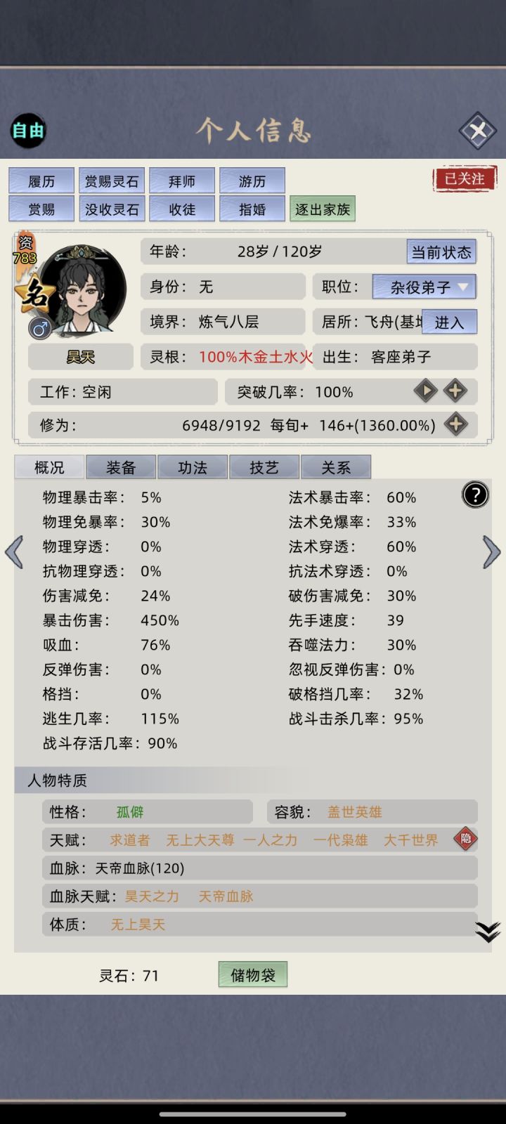 1.五大名人(韩老魔,荒天帝,叶天帝,王麻子,炎帝)俘虏之后在家族待一年就会逃跑。2.血脉配种:(1)五大名人血脉配出120血脉出现金色天赋,孩子18岁成年之后会脱离家族(等于白配)。(2)名人血脉只有120的时候才会出血脉天赋。(3)五大名人之间血脉不能兼容3.抓名人留血脉方法:第一种:让名人成为族长就不会逃跑(听说因为族长代码高,普通弟子代码低) 步骤:开局选太上长老,让现任族长去