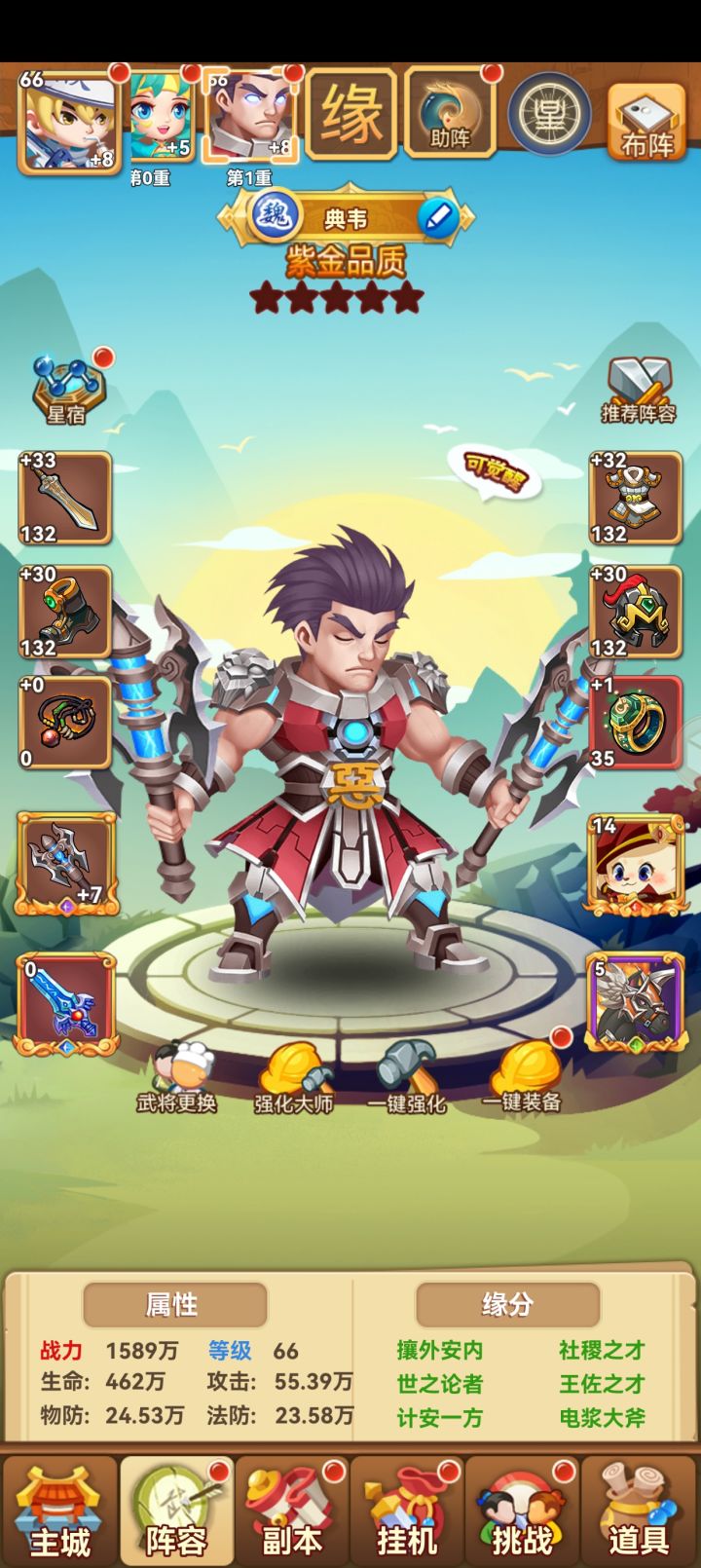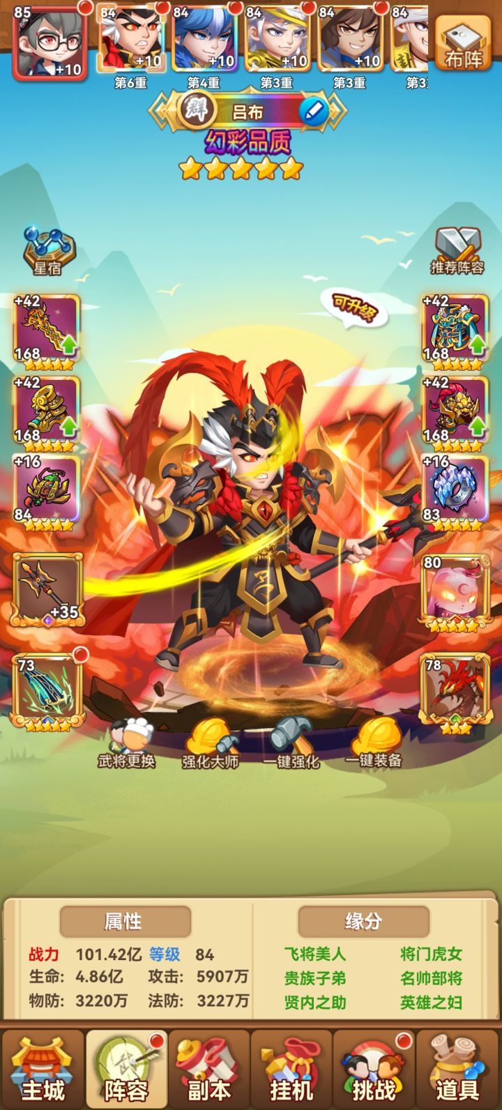 本人1020区,今天刚好是玩游戏的十二天,本人微氪档,至今磕了六十块钱左右,然后现在六十七级,战力一亿九千万左右提示:此攻略适合0氪和微氪再开始游戏之后建议先领取对应福利码一、阵容板块1)主角就是挂件2)武将武将的话前期红色练练,后期练紫金3)星位玩家到达一定等级后会解锁星位。实际上星位是有好几页的!本人也是刚知道首先星位属性 攻击固定值=攻击百分比=伤害加成=PVP增伤>PVP
