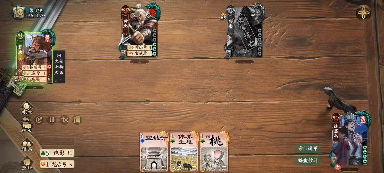 【35】晋 ①对韩信使用顺手牵羊,获得银狮盔,装备银狮盔,回1血; ②对韩信使用借刀杀人,己方掉血触发技能“乱世奸雄”获得1张杀,注意这张杀不能马上使用。再对韩信使用借刀杀人,获得装备惊羽弓。装备惊羽弓,对韩信打出杀,获胜。 这是之前查到攻略,可我这没有借刀杀人啊[表情_暗中观察]#名将杀 #名将杀武将 #名将杀攻略