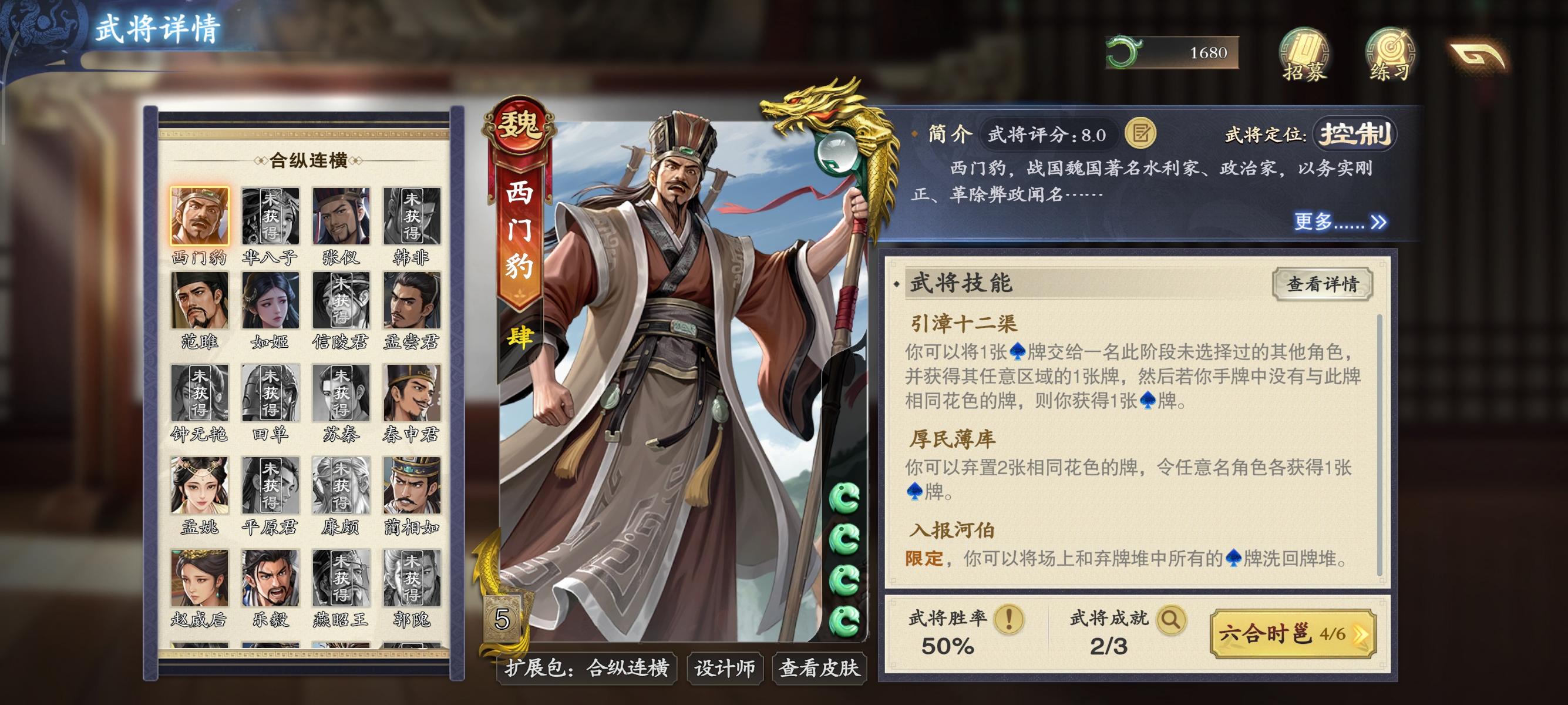 1.今天开服玩了几把豹子哥虽然胜率50(辅助太吃输出的意识了),但是很快乐。这种烂阵容都能赢。2.豹子哥技能很简单。同花色2张制衡。黑桃换对面牌,换回来花色手里单,再给一张黑桃。3.目前我感觉豹子哥控制很强,偷马,偷武器,找顺拆,找乐(顺拆乐都是黑桃)。输出基本没有,因为都在制衡。队友不容易暴毙,往往一手闪,但是自己很虚,没卡住对面距离,很容易在1血挣扎。4.目前感觉配合2种,一个孙权这种制