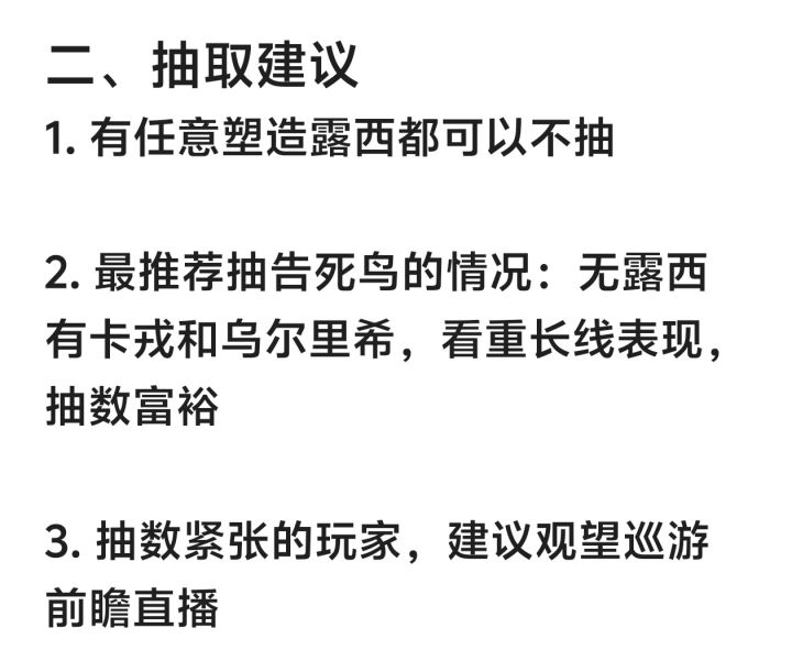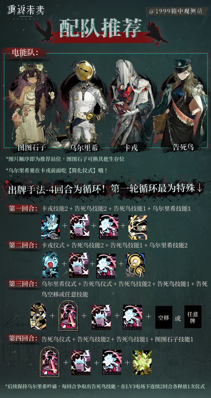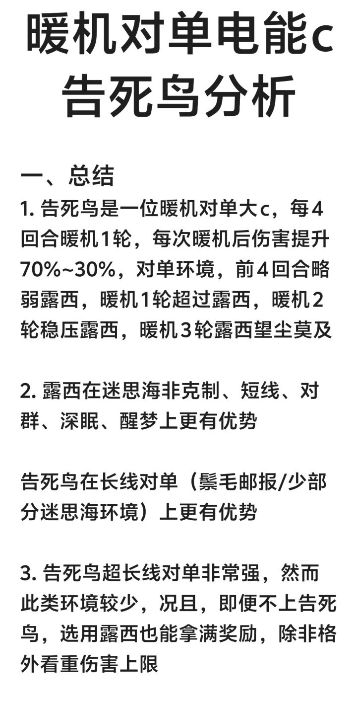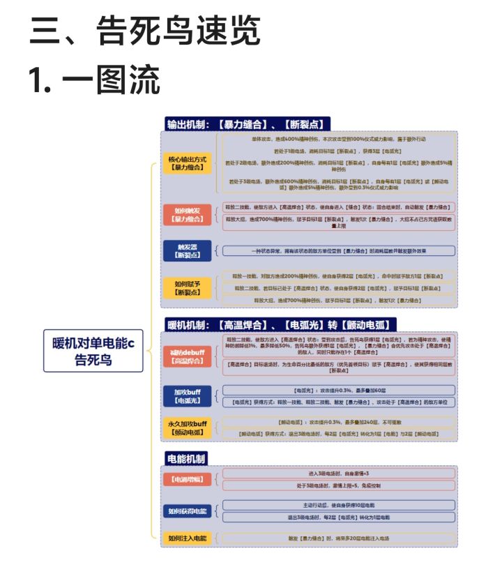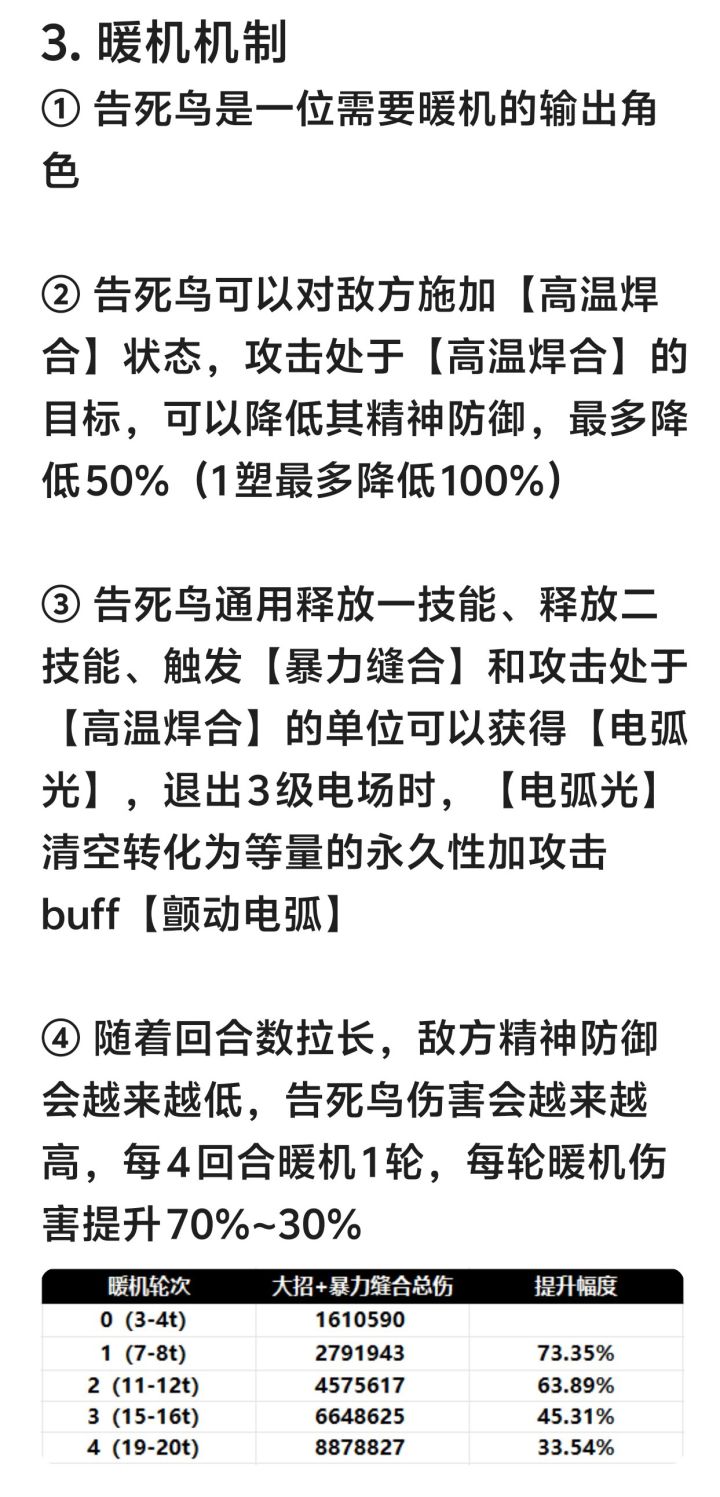 图2告死鸟总结 图3抽取建议 图4告死鸟机制一图流 图5输出机制介绍 图6暖机机制介绍 图7电能机制介绍 图8 露西和告死鸟组队情况 图9卡戎和乌尔里希作用与告死鸟队友选择 图10露西电能队vs告死鸟电能队 图11共鸣摆法、调频、心相AfQkOEUrRCkFOgQ8ADwQNCI0IClCQFBCUUVA 图12塑造 图13配队与具体出牌#重返未来1