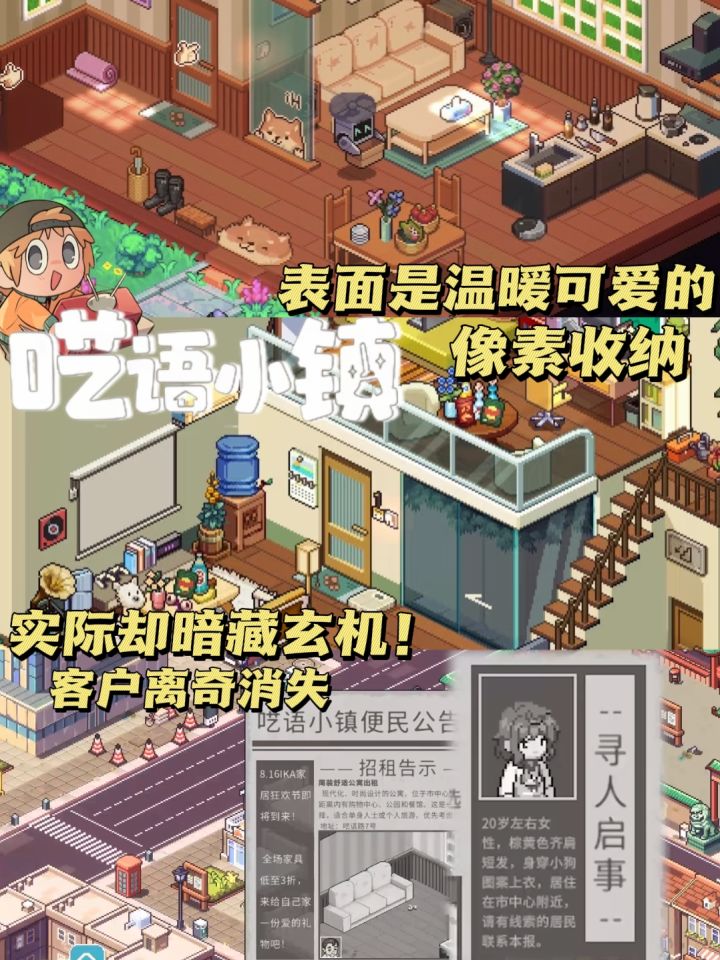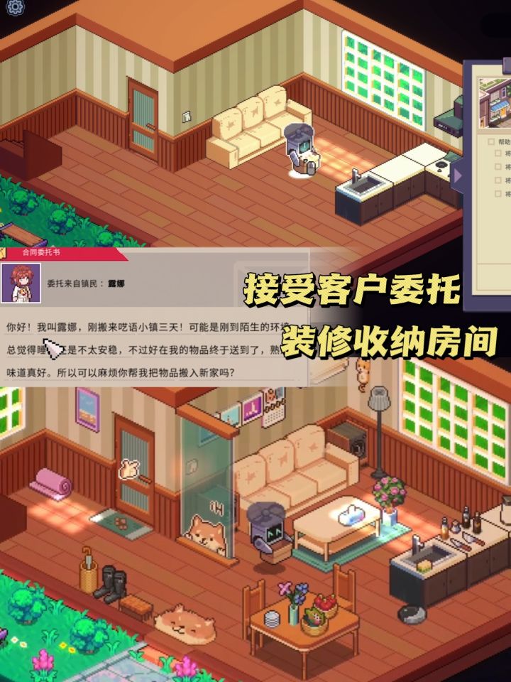 • 身份:受镇长邀请的全能家政工,小机器人马克协助工作。• 世界观:温馨像素小镇暗藏异常,以闪烁数字的金字塔为核心谜团;处理异常会让塔顶数字减少,推进主线。• 调性:治愈日常+微悬疑,兼具整理的解压感与剧情的探索欲。核心玩法1. 委托与整理:搬家、打扫、收纳、筹备新店、找猫等;清扫污渍、拆分破损家具、垃圾分类;按雇主要求摆家具,房间进度100%即完成。2. 收集与