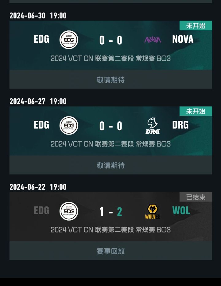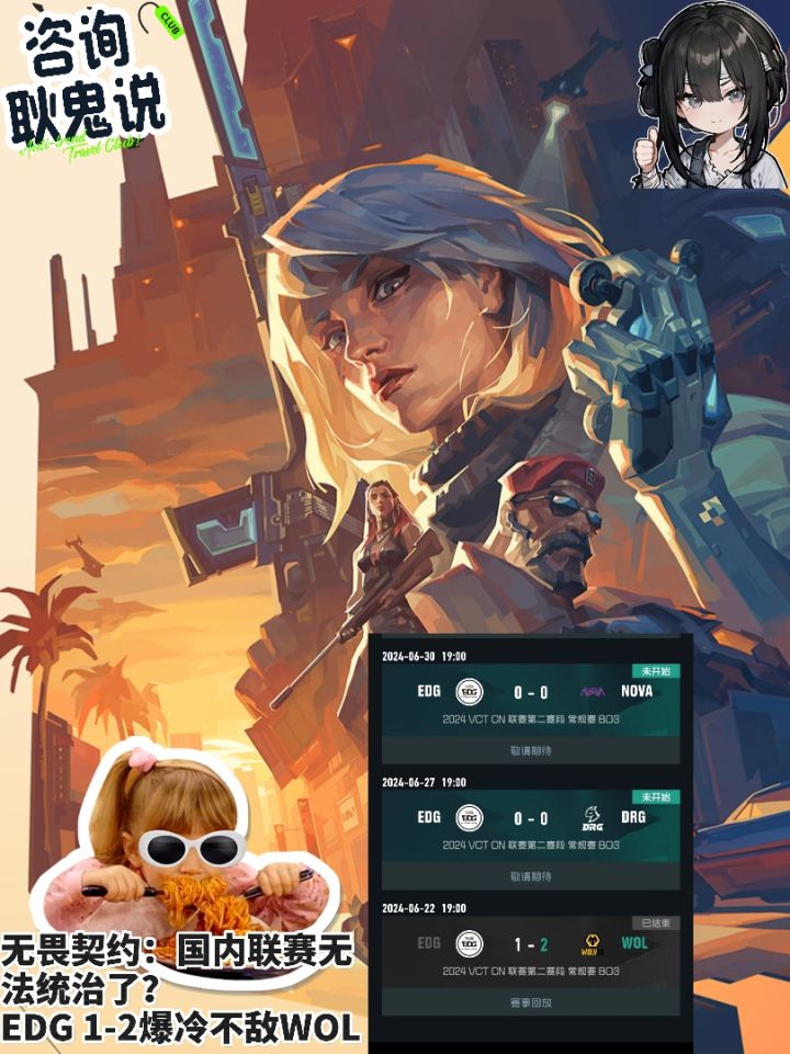国内联赛无法统治了?北京时间6月22日,无畏契约VCT-CN联赛第二赛段,EDG对阵WOL。图一来到EDG的霓虹町,WOL被毫无悬念的大比分碾压。图二源工重镇EDG展示出十足的韧性在与WOL的对抗中紧咬比分,但最终EDG遗憾落败。图三森寒冬港在双方持续的拉锯战中由WOL再次赢得胜利,最终WOL 2:1 EDG获得本赛段首胜。只能说再接再厉家人们。#比赛 #耿鬼鬼 #游戏咨询 #咨询 #今天游