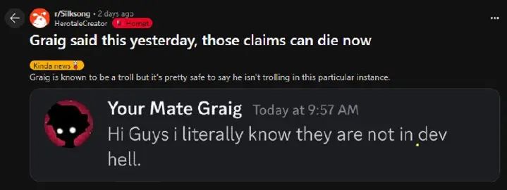 《空洞骑士:丝之歌》是《空洞骑士》游戏的续作。玩家将扮演Hornet,在一个全新的由丝绸和歌曲统治的国度冒险。Hornet被敌人抓到这个陌生的国度,他必须一路上击败敌人、解决谜题。 进期游戏展会都没有出现,期待的玩家都担心游戏是否有开发进度困难。 还好游戏制作组出来辟谣宣称:游戏没有出现开发困境。 看到这我也是悬着的心放下了一会,毕竟一代的高质量游戏体验和画风非常不错所以《空洞骑士:丝之歌》