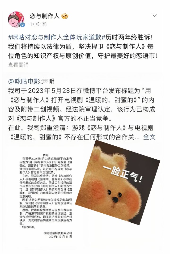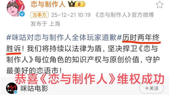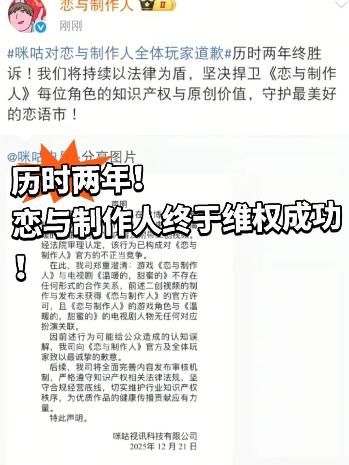 2025年12月21日上午10点,《恋与制作人》官博转发咪咕视频道歉声明。并称历时两年终胜诉,未来也将捍卫每位角色的只是产权和原创价值。事情是这样的,2023 年 5 月,咪咕视讯科技有限公司通过 “咪咕剧集” 官方微博发布了标题为 “用《恋与制作人》打开电视剧《温暖的,甜蜜的》” 的二创视频。同时,在视频中未经授权使用游戏角色名称:李泽言、周棋洛等;宣传PV原声音频;音乐特效以及配音等。将