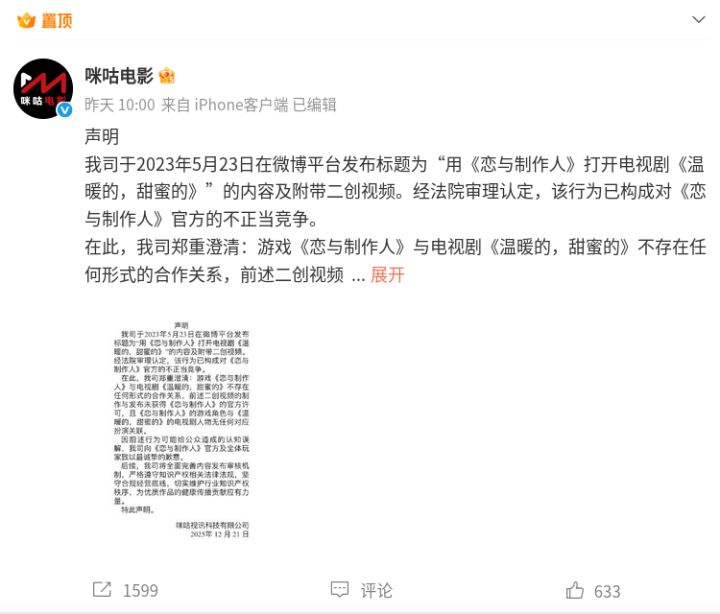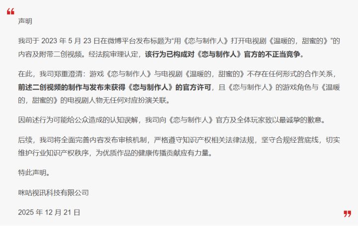 北京时间2025年12月21日,咪咕视讯旗下“咪咕电影”官方微博发布道歉声明,承认其此前发布的一则涉及《恋与制作人》的二创视频构成不正当竞争,并向游戏官方及全体玩家表达歉意。咪咕公司发布声明称,其于2023年5月23日在微博平台发布标题为“用《恋与制作人》打开电视剧《温暖的,甜蜜的》”的视频内容及附带二创素材未经授权,且法院审理认定该行为构成对《恋与制作人》官方的不正当竞争,为此向游戏官方和玩家