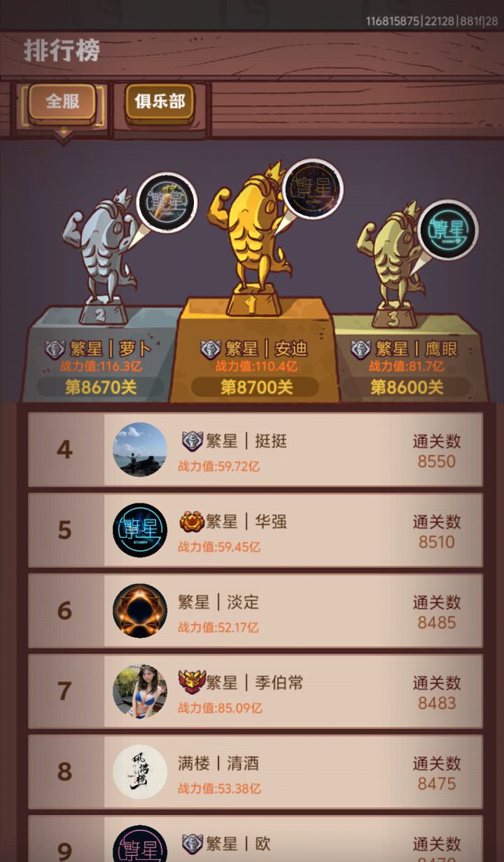 22101繁星招人,新人起号福利多多,供金币罐子号卡片全部安排到位,4000关带十殿,盐场带炸鱼,氛围极佳,微信群里每天消息99+,车头实力在线,活跃人数300+,目前一二团稳定月赛,其余有分高周,炸鱼等分组。欢迎所有氪度的兄弟,萌新小白全程指导,保护。也欢迎车头大哥转区大哥加盟,补贴满满。结尾附带本人带炸鱼的战绩有意者可#咸鱼之王 #咸鱼之王俱乐部收人 私聊