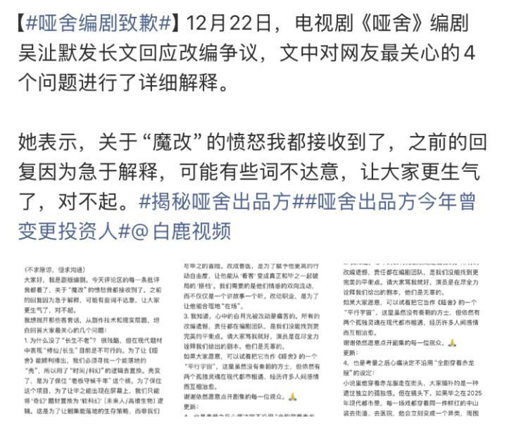 哑舍电视剧编剧道歉,魔改剧情她也无奈
