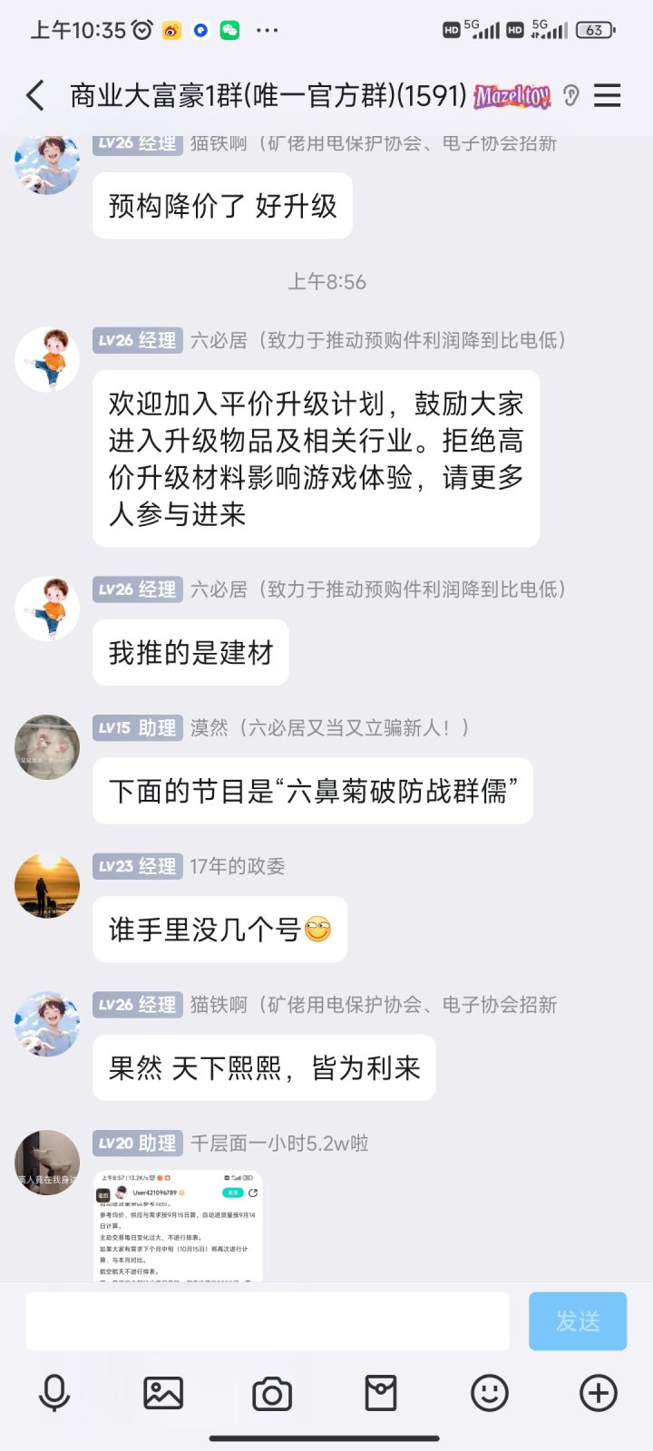 六必居大佬是做厨房的,众所周知厨房升级比较高,所以六必居脑袋一转想出来一计,推荐新人疯狂去建材产业,这样自己升级的成本就能压下来了。通过在群里不断忽悠人,加入建材产业,注意他的逻辑,建材平价话,就是争取让建材不挣钱,但是呢他又不停的鼓吹建材利润多高让新人都进去,他的目标就是把建材产业搞垮,至于被忽悠进去的人死不死就不关他的事情了。目前前线战报,群里所有人基本上都在骂他,大有玄圣二代的架势,青出