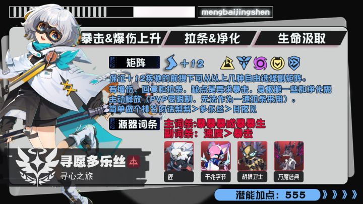 1、DOT逃课高难请将源器全换为生存词条。2、控制依赖拿鹤的减防控制大大提高莉拉姆的生存及输出,pvp同样可玩(pvp篇再细讲)3、普攻队荼蘼的普攻增伤和罗喉的多动可以说相辅相成。因为罗喉大招提供的防御加成只持续2回合,而冷却是四回合,所以需要梨梨增益罗喉。如果用水月真,则将渺渺替换为其他增益或拉条角色。或选择荼蘼+罗喉+水月真。4、复活流对群能力较差,打不了多琪本。常规本想不