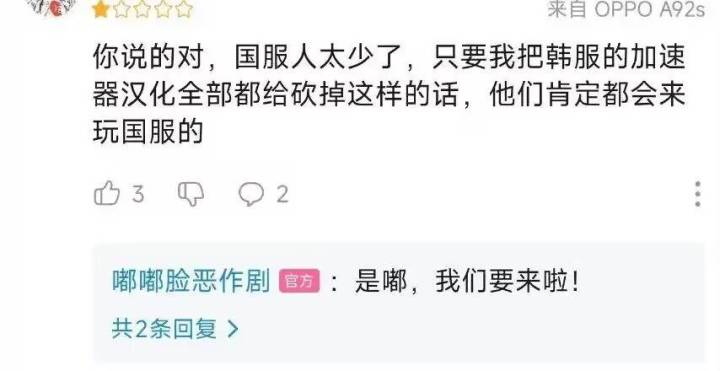 属性减半,蜡笔爆率减3倍,氪金贵,装备碎片需求量变多同时金币价格翻十倍,作为一个游戏官方汉化不如机翻,主角团姐姐妹妹分不清,2星角色变3星污染卡池,外挂满天飞却只封个别的,而且外挂的代价只有短短7天封禁。就算这样运营也不觉得玩家流失是自己的问题,反手断了作为前辈自发引路拉人的韩服玩家的路。没有热心韩服玩家你们连wiki都做不出来,因为你们是抄的人家劳动成果,自己啥也不是眼里只有米