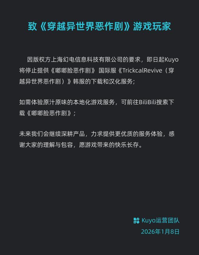 1月8日,知名手游工具Kuyo发布公告,应版权方B站(上海幻电信息科技有限公司)要求,即日起正式停止《嘟嘟脸恶作剧》国际服、韩服的下载与汉化服务,并建议玩家前往B站下载国服版本。这一举措标志着B站拿下该作代理权后,开始对民间汉化及外服直连渠道全面“清场”。然而这场 “正版化” 操作却引发玩家集体愤怒,评论区负面反馈一边倒。老玩家直言,这款游戏本是靠民间汉化组(Kuyo的机翻润色让玩家看懂剧情)和