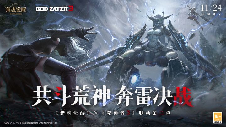 网易超真实团队狩猎手游《猎魂觉醒》与万代南梦宫娱乐动作冒险人气大作《噬神者3》重磅联动来袭,将于11月24日开启!联动第二弹内容汇总出炉,本次联动的精彩内容、超值福利一网打尽,一起来看看吧!【猎神终战来袭】当最终之战来袭,新的一批神机使AGE及时降临艾兰特大陆,带来强大战斗助力,更有完美还原《噬神者3》人气角色的联动礼装,助你亲手打破这浓浓灰雾!翱翔于天际的翅膀,终将划破绝望的长夜,最后的战斗