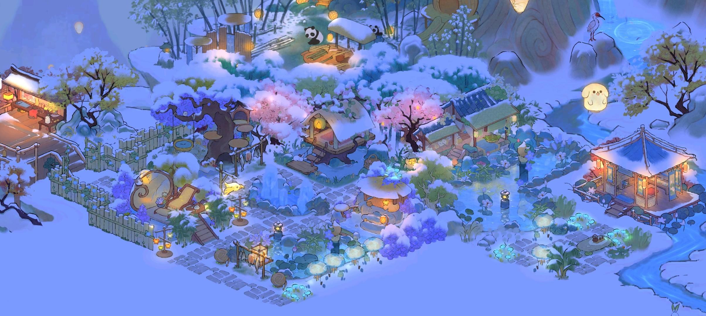 雪天怎么能少得了熊猫和竹子呢?下雪就是要红红火火的,挂上灯笼,庆祝新年。很急,在线等一个赞。#四季桃源之雪景