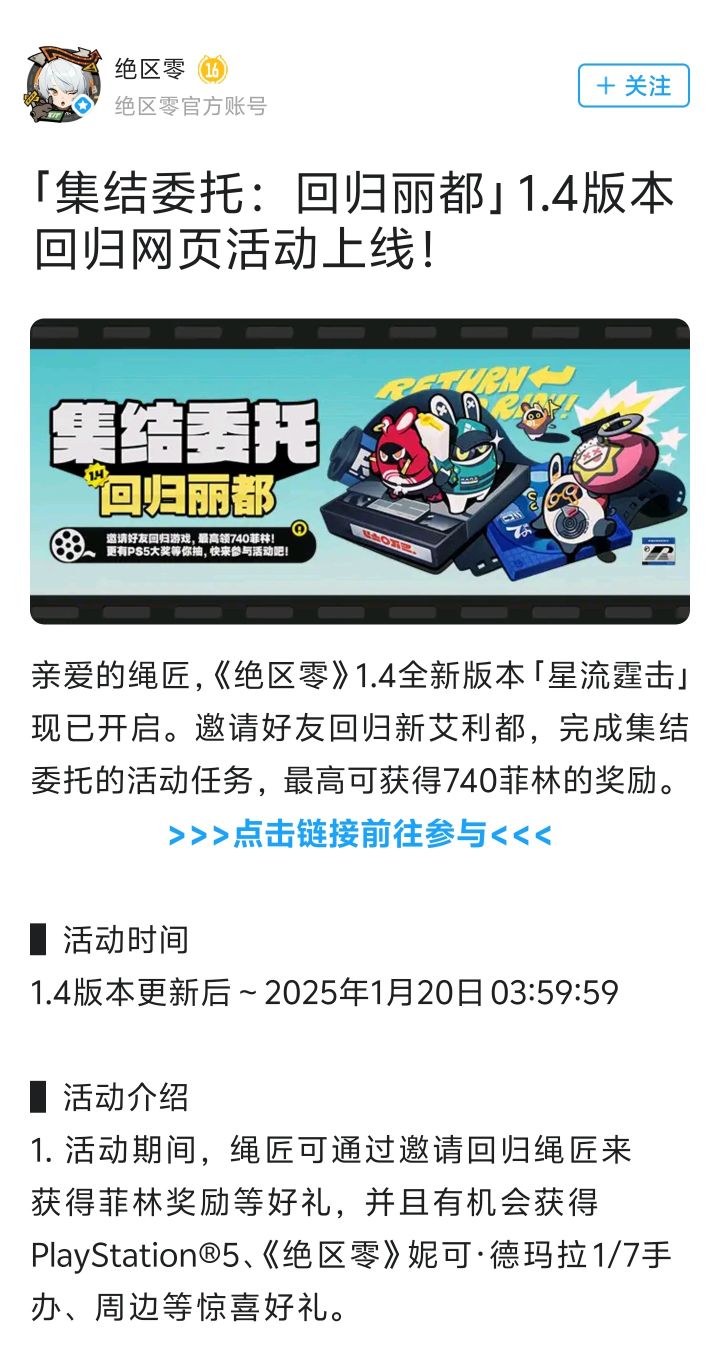 #绝区零 #回归奖励 进入页面左边填入我的邀请码:CAM8DANACP绳匠回归《绝区零》并完成相关任务,最高可获得800菲林!还可抽取PlayStation®5、安比手办等惊喜好礼。https://mhyurl.cn/blUlFDAL?s_c=CAM8DANACP
