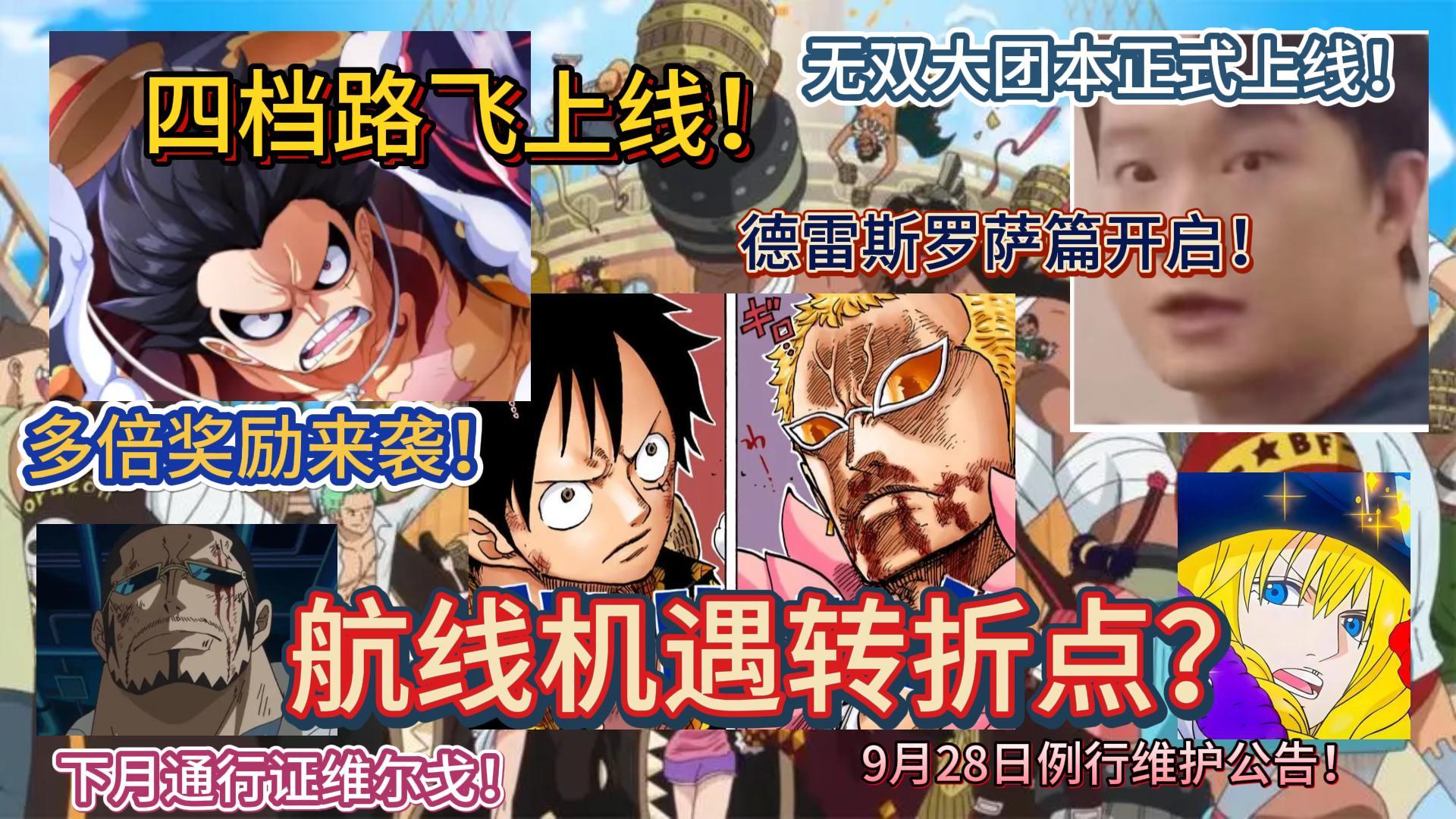 四档路飞上线!国庆版本能否成为航线机遇转折点?无双大团本正式上线!多倍奖励来袭!下月通行证维尔戈!德雷斯罗萨篇开启!9月28日例行维护公告!【航海王热血航线】