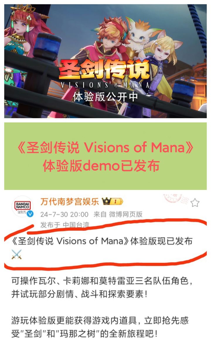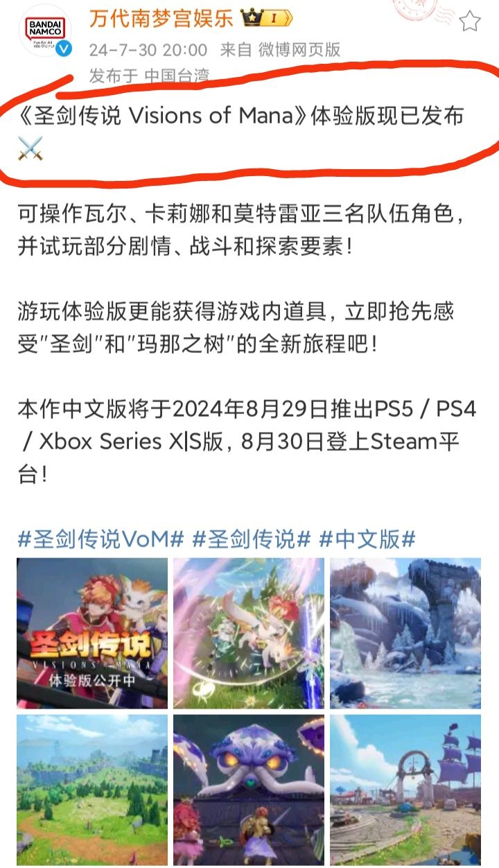 7/30号晚,万代南梦宫官博发文宣布:《圣剑传说 Visions of Mana》体验版已发布❗❗❗玩家可操作瓦尔、卡莉娜和莫特雷亚三名队伍角色,并试玩部分剧情、战斗和探索中文版将于8月29日推出PS5/PS4/Xbox Series X|S版,8月30日登上Steam就是没有NS平台的,不知道大家怎