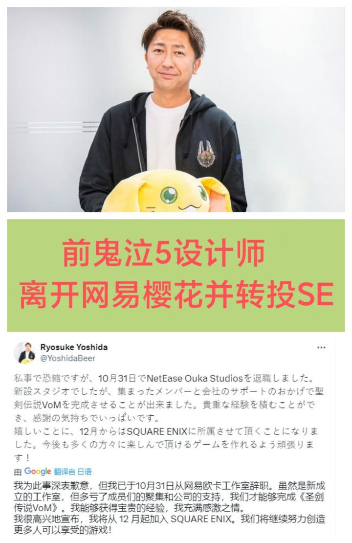 12月2日,吉田亮介(Ryosuke Yoshida)宣布,他已于10月31日从网易樱花工作室离职,并将于12月加入SE❗❗❗至于具体的离职原因,他并未说明,仅对樱花工作室及其团队表达了感谢。不过,或许跟今年8月份彭博社报道“网易将关闭樱花工作室”的消息有关据悉,吉田亮介于2020年加入网易樱花工作室,曾担任过《鬼泣5》、《怪物猎人X》等游戏的设