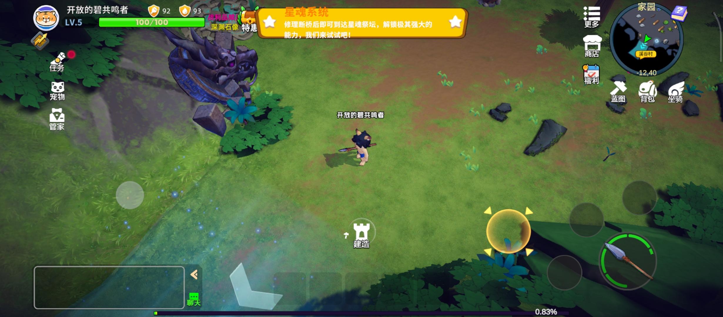 因为游戏比较硬核,所以以下我给大家带来一个新手的流程,希望能给大家带来一点帮助。 1.大家的新手引导完成后,会出现在这个地图---浅草滩。这里有不少的基础资源,怪物也不是很厉害,建议到处逛逛,欺负一下小猪小鸡,收刮一些资源。背包快塞满的时候就可以从这里回到溪谷村,再回家园2.通过传送门我们到达了溪谷村,再往下走几步就可以看到家园的传送门入口了。3.溪谷村有一些村民,也有小商贩。比如这个小商