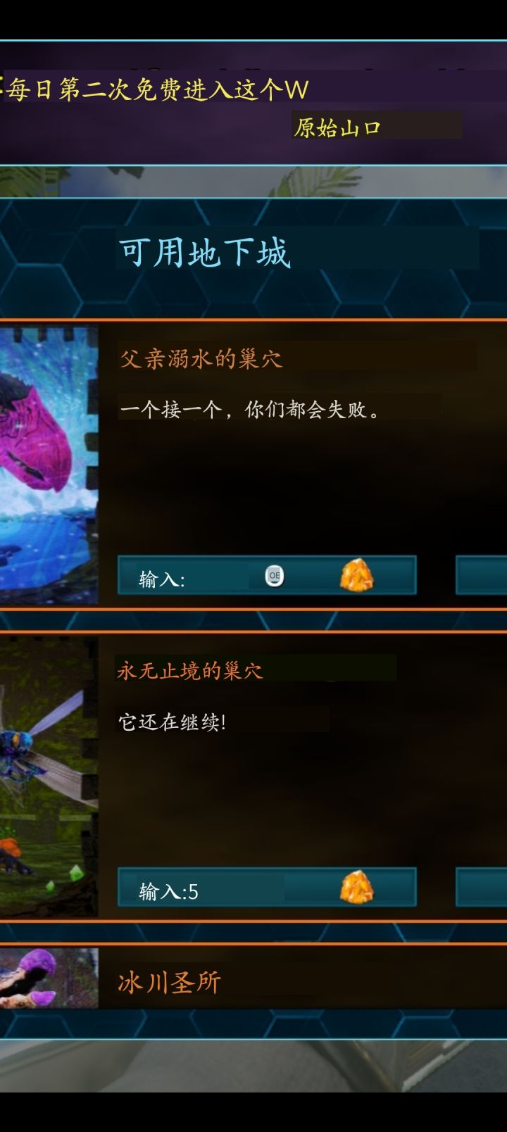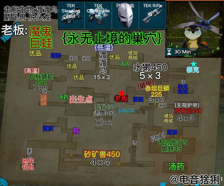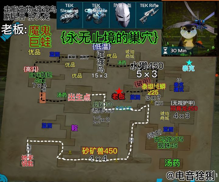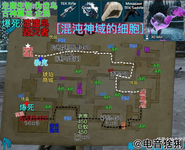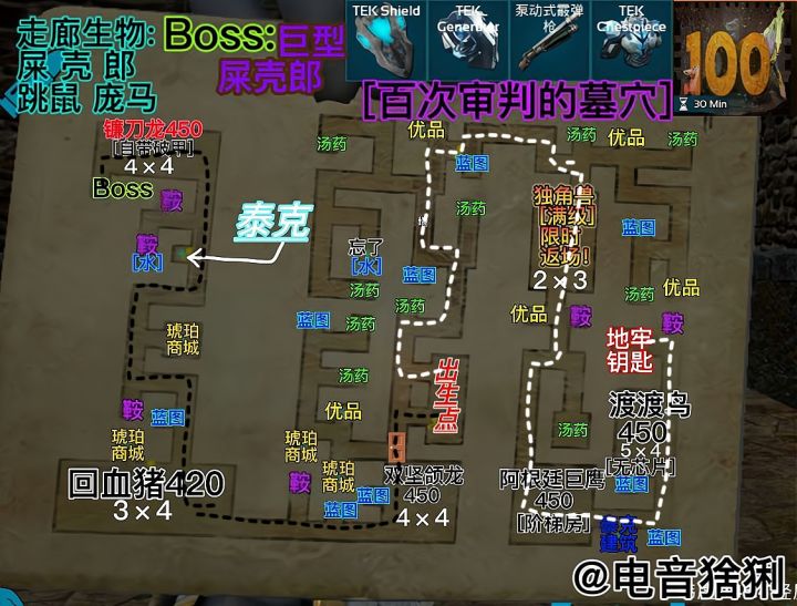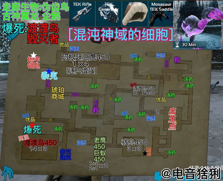 地牢难度:★★☆☆☆推荐指数:★★★★★奖励:12.5补给准备:食物水若干.红瓶*25 绿瓶*10 啤酒*3兴奋剂*2 火锅辣椒*2 低温汤*1 降落伞*2流星锤*12主线①独角兽:只会跑,简直就是福利地图,而且全是当前难度的最高等级.主线②阿根廷巨鹰:阶梯房,单机退出重进可以直接通关.主线③渡渡鸟:拿远程武器爆头一下秒掉,没有芯片.主线④双坚颌龙:躲在角落拿刀砍,也可以喝啤酒增加